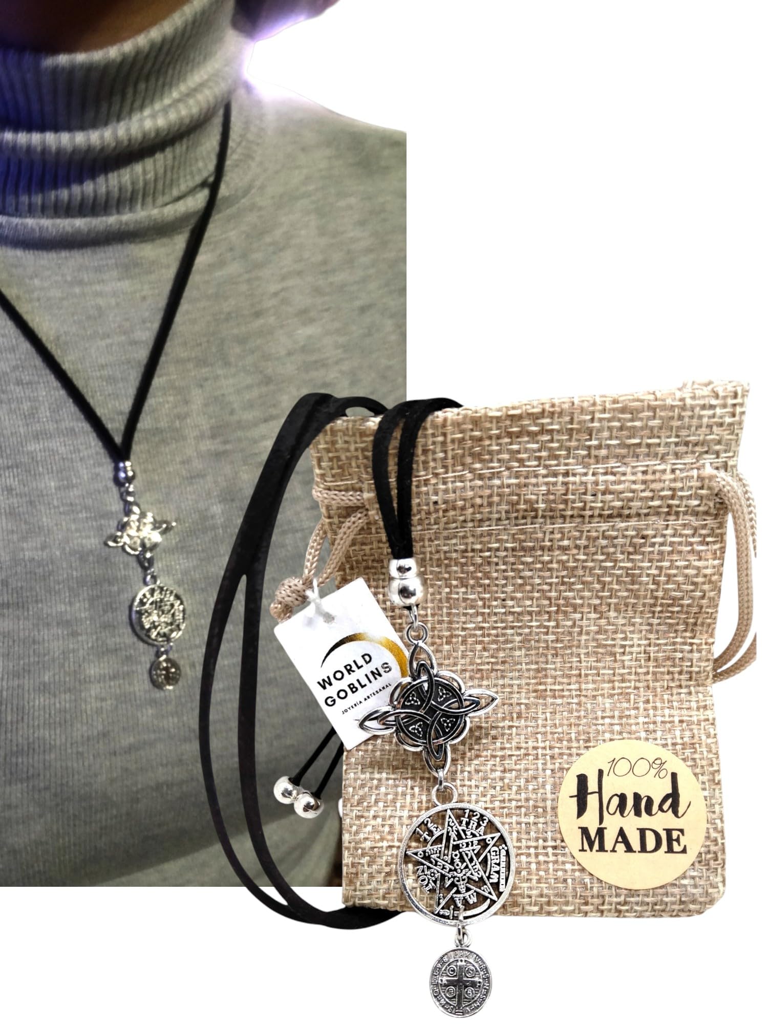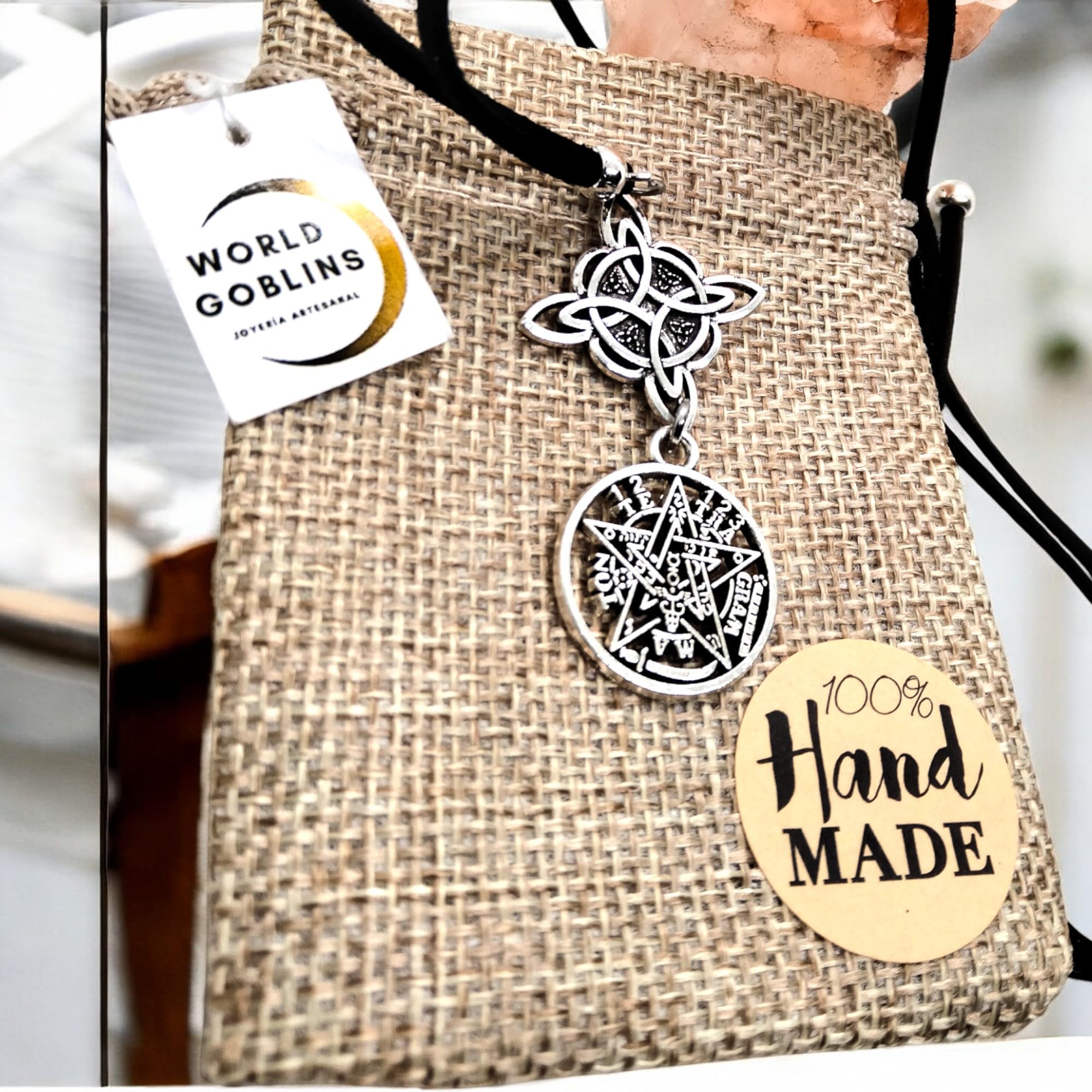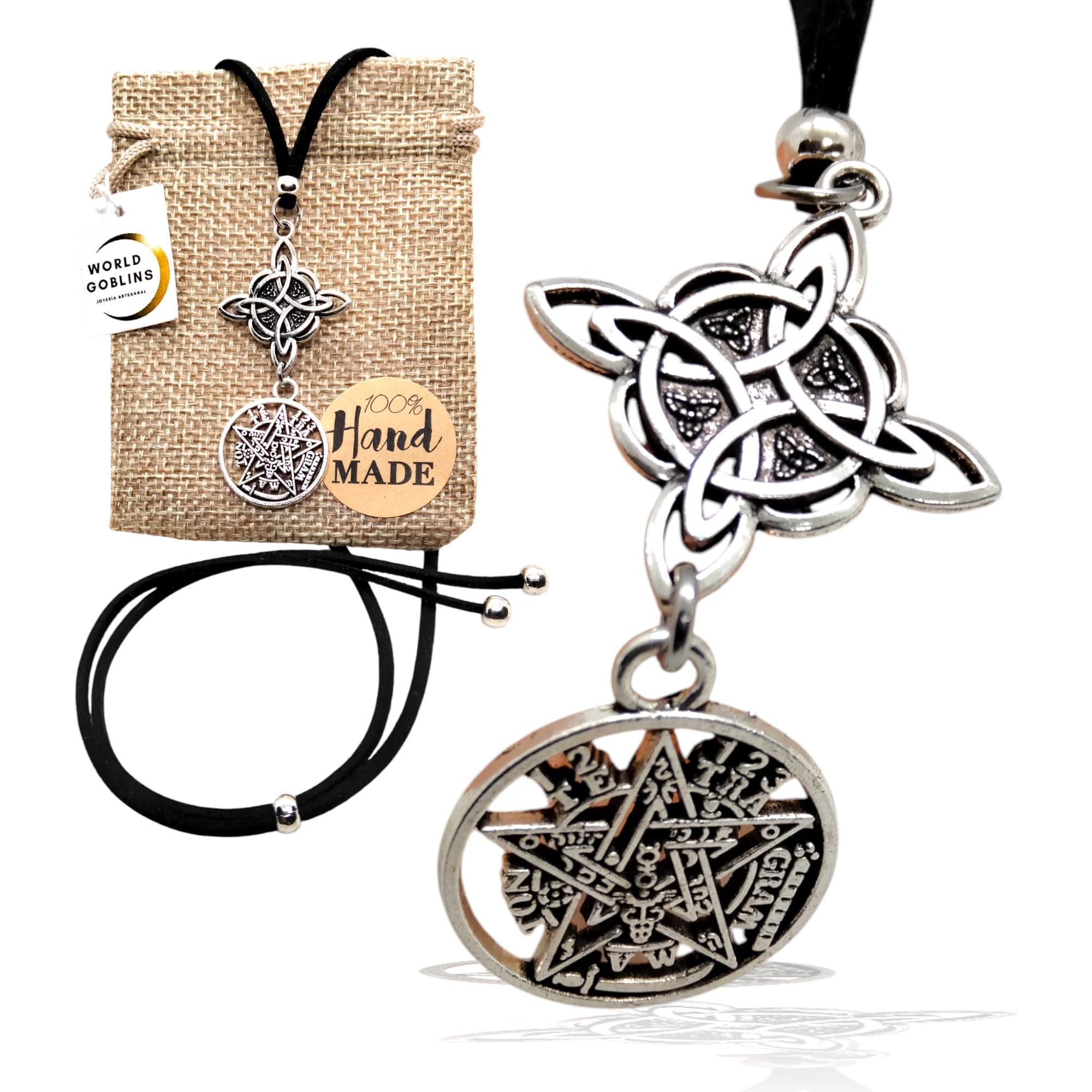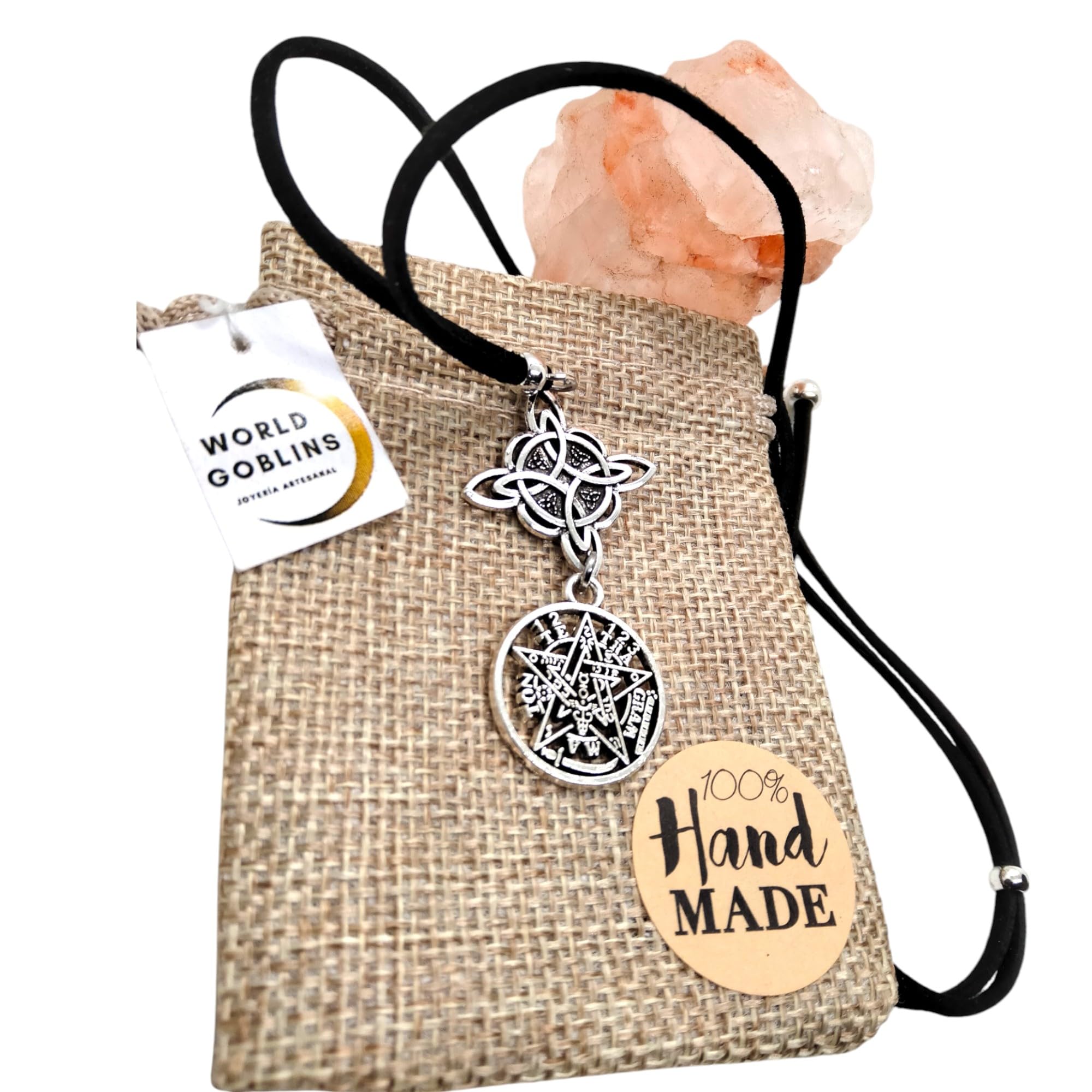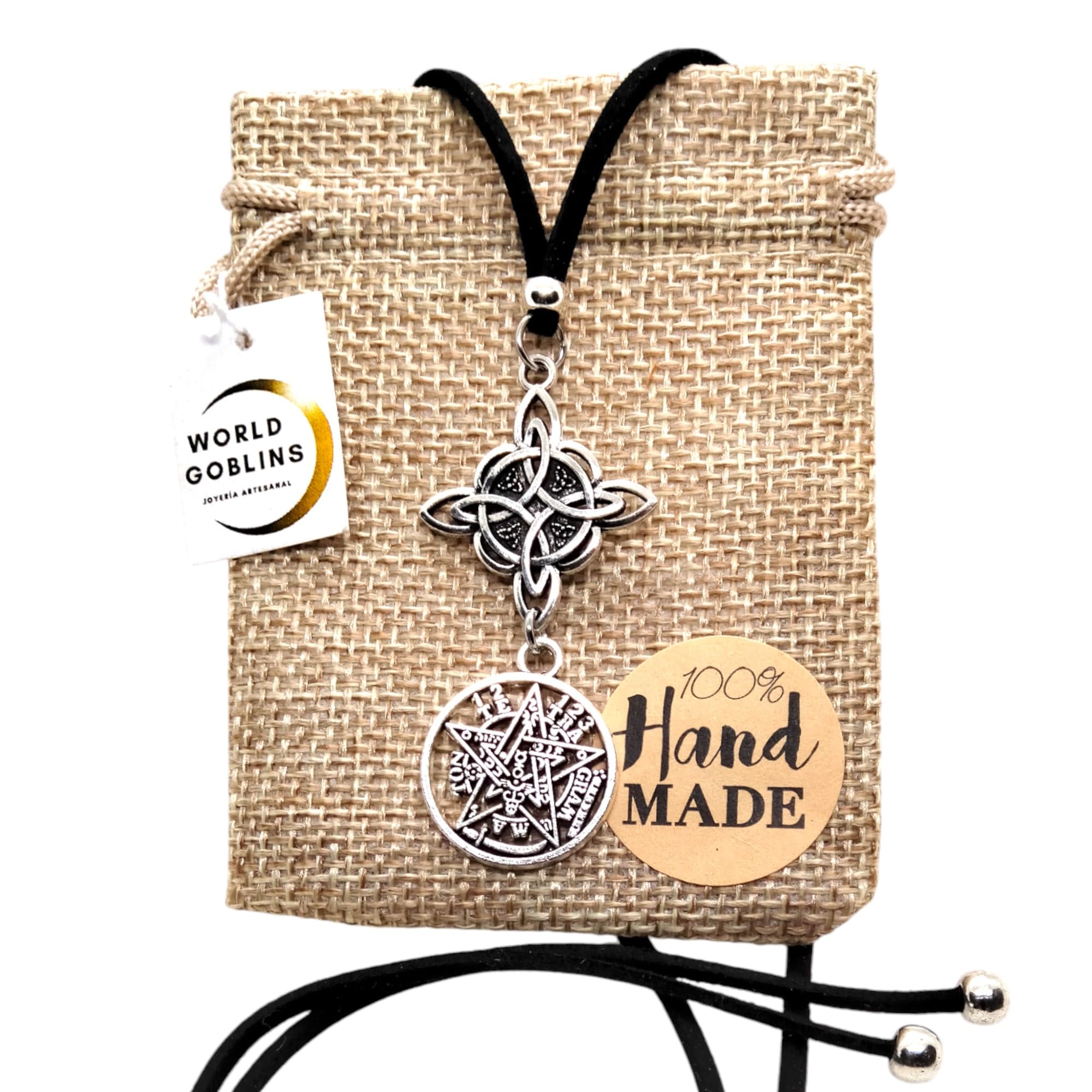 - 🌟 AMULETO PROTECTOR Combina el Nudo de Bruja , asociado con poderes místicos, y el Tetragramatón , símbolo antiguo de protección, creando una barrera completa contra malas energías