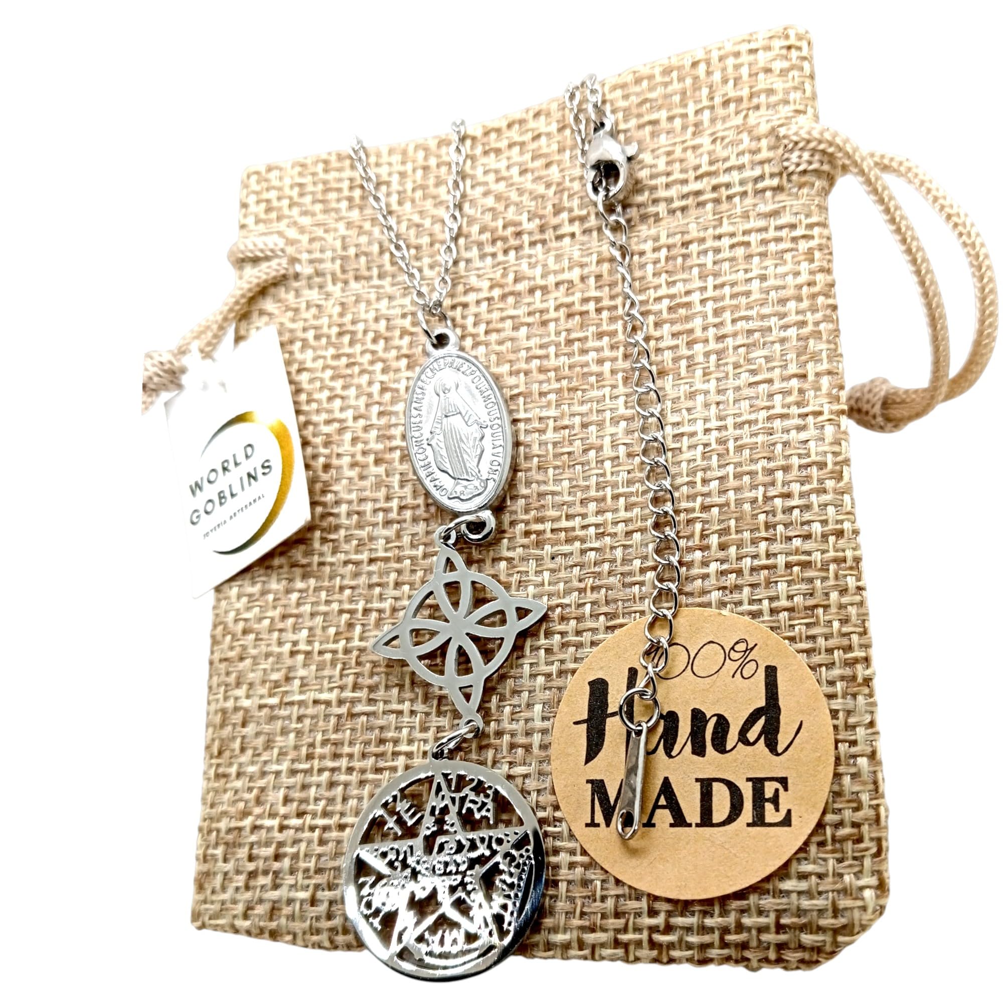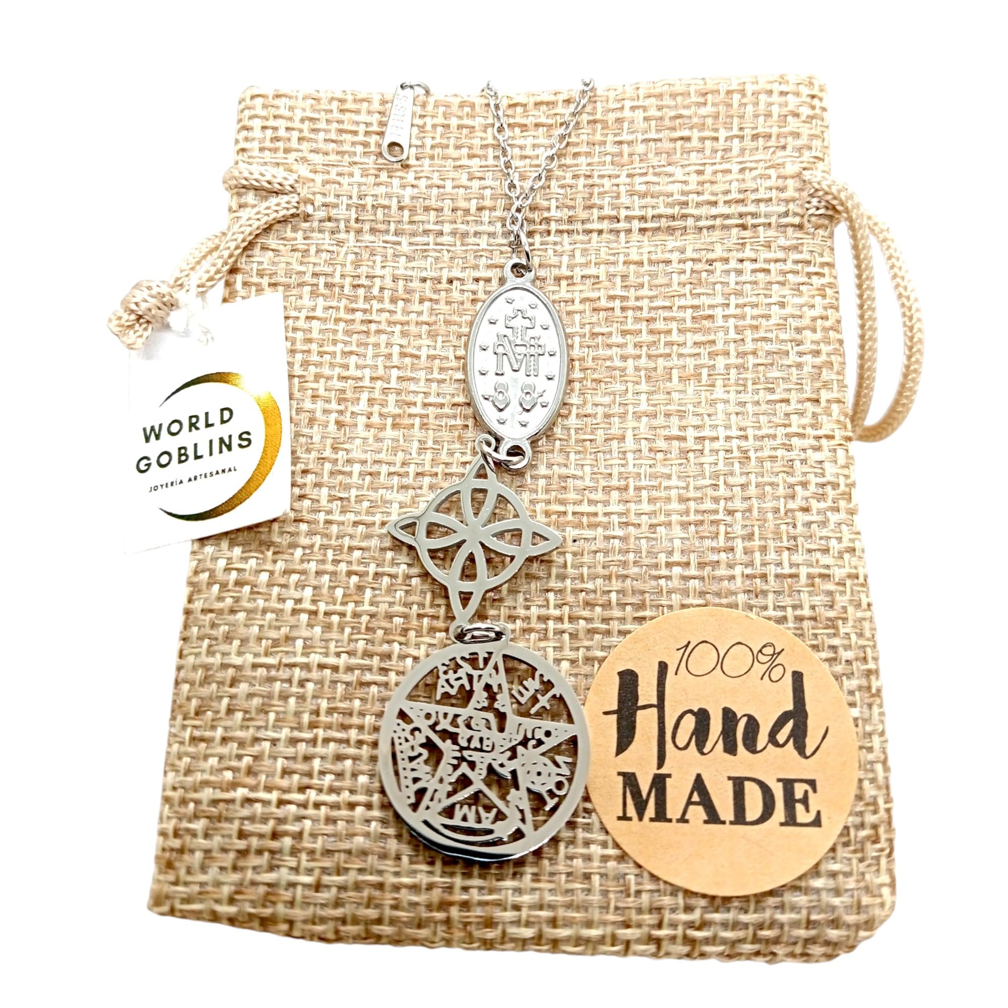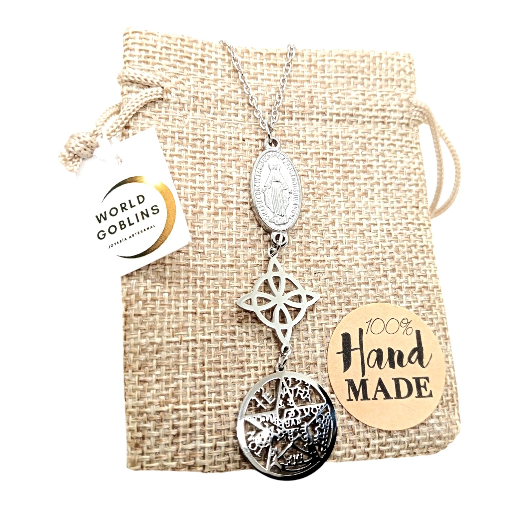 Detalles: Collar de Triple Protección fabricado en acero inoxidable de titanio 316L de alta resistencia. Combina tres poderosos amuletos: Nudo de Bruja (18mm), Tetragramatón (20,5mm) y Virgen Miagrosa (15mm), unidos en una joya única de energía espiritual y protección. Hecho a mano en España por WORLD GOBLINS. Este collar simboliza fuerza, fe y equilibrio. Incluye cadena de 45cm adaptable a 48cm, ideal para mujer. Se entrega en bolsa de yute artesanal, lista para regalar o usar como talismán personal