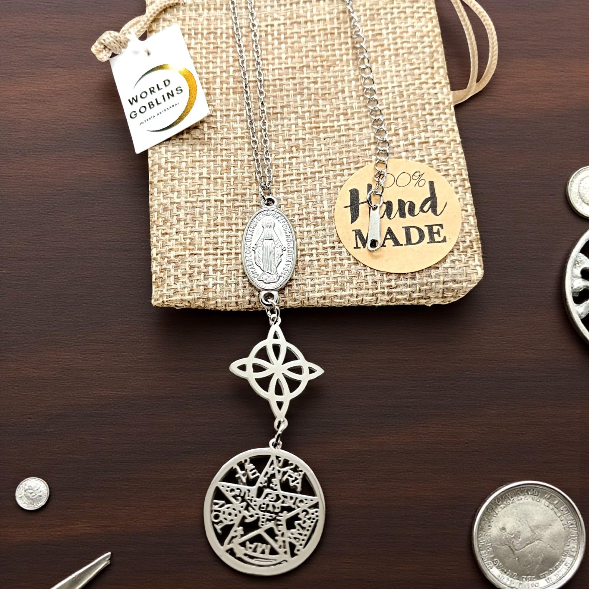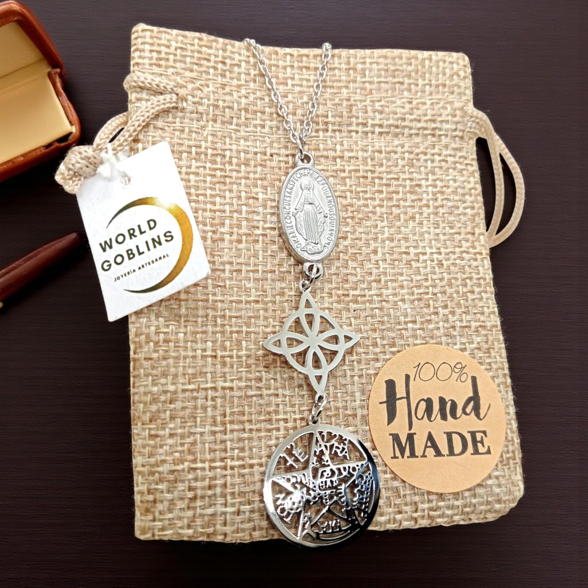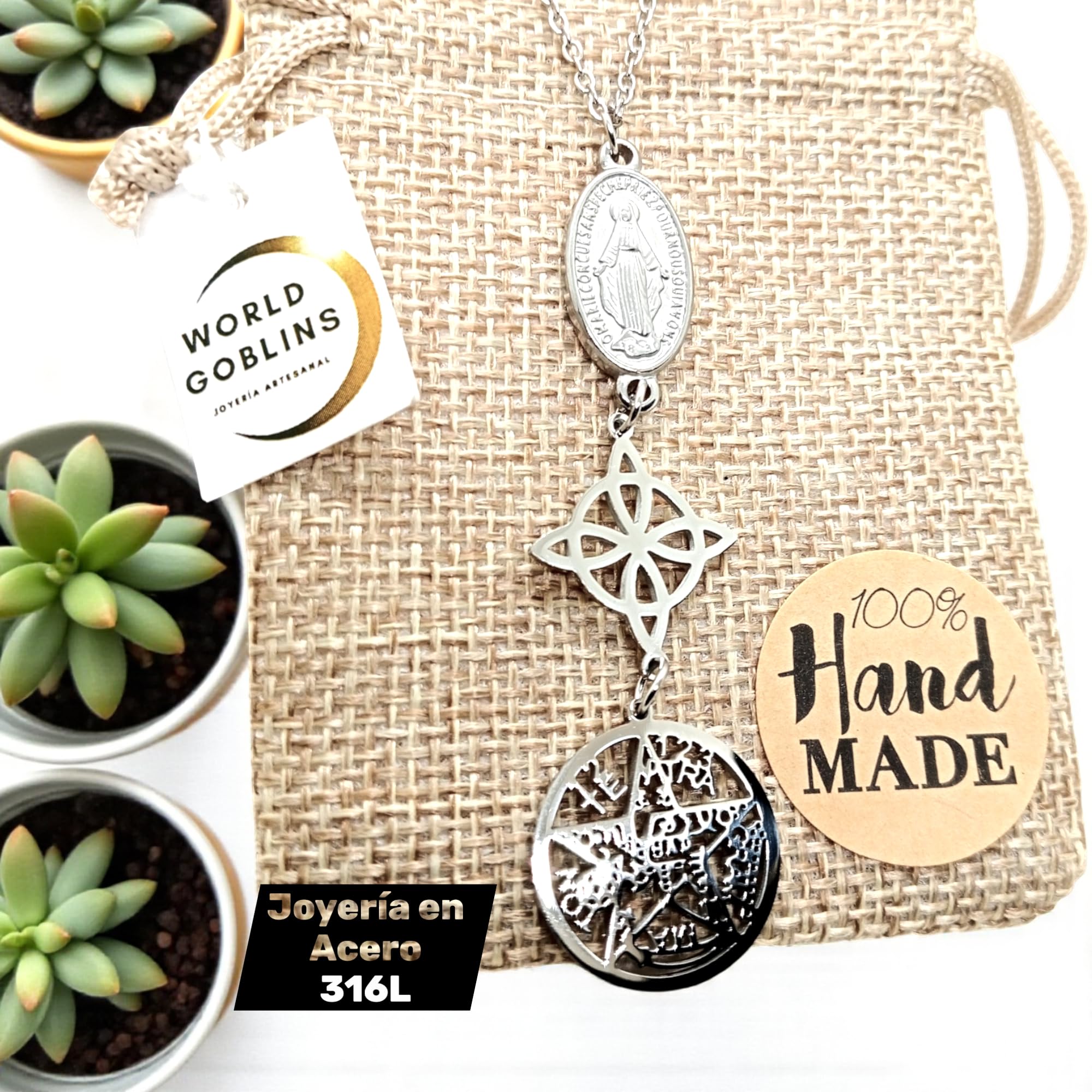 Detalles: Collar de Triple Protección fabricado en acero inoxidable de titanio 316L de alta resistencia. Combina tres poderosos amuletos: Nudo de Bruja (18mm), Tetragramatón (20,5mm) y Virgen Miagrosa (15mm), unidos en una joya única de energía espiritual y protección. Hecho a mano en España por WORLD GOBLINS. Este collar simboliza fuerza, fe y equilibrio. Incluye cadena de 45cm adaptable a 48cm, ideal para mujer. Se entrega en bolsa de yute artesanal, lista para regalar o usar como talismán personal