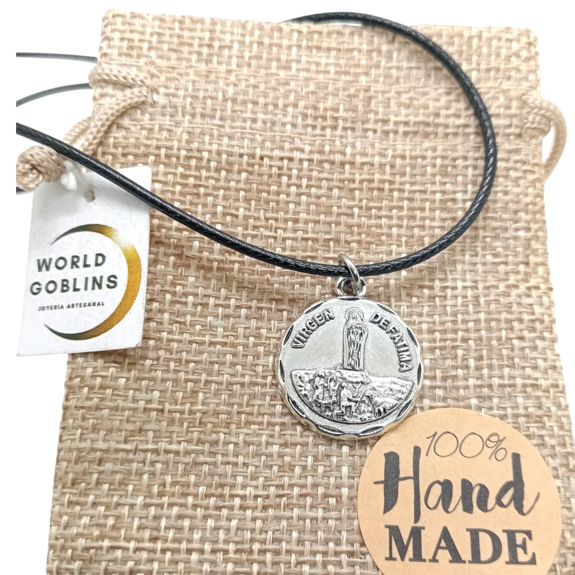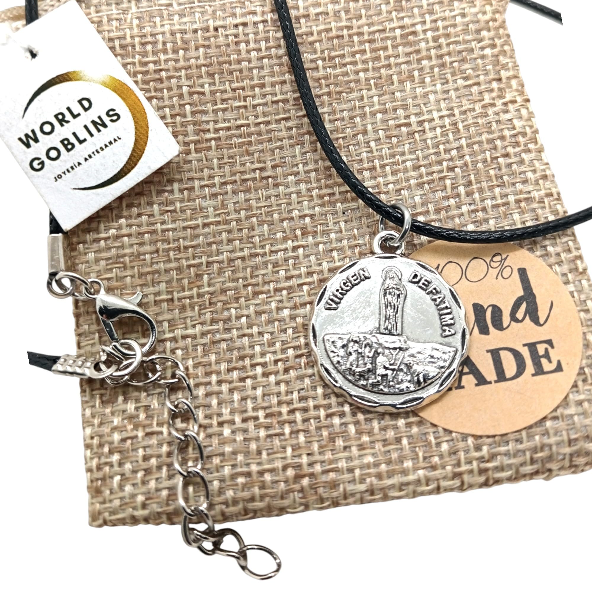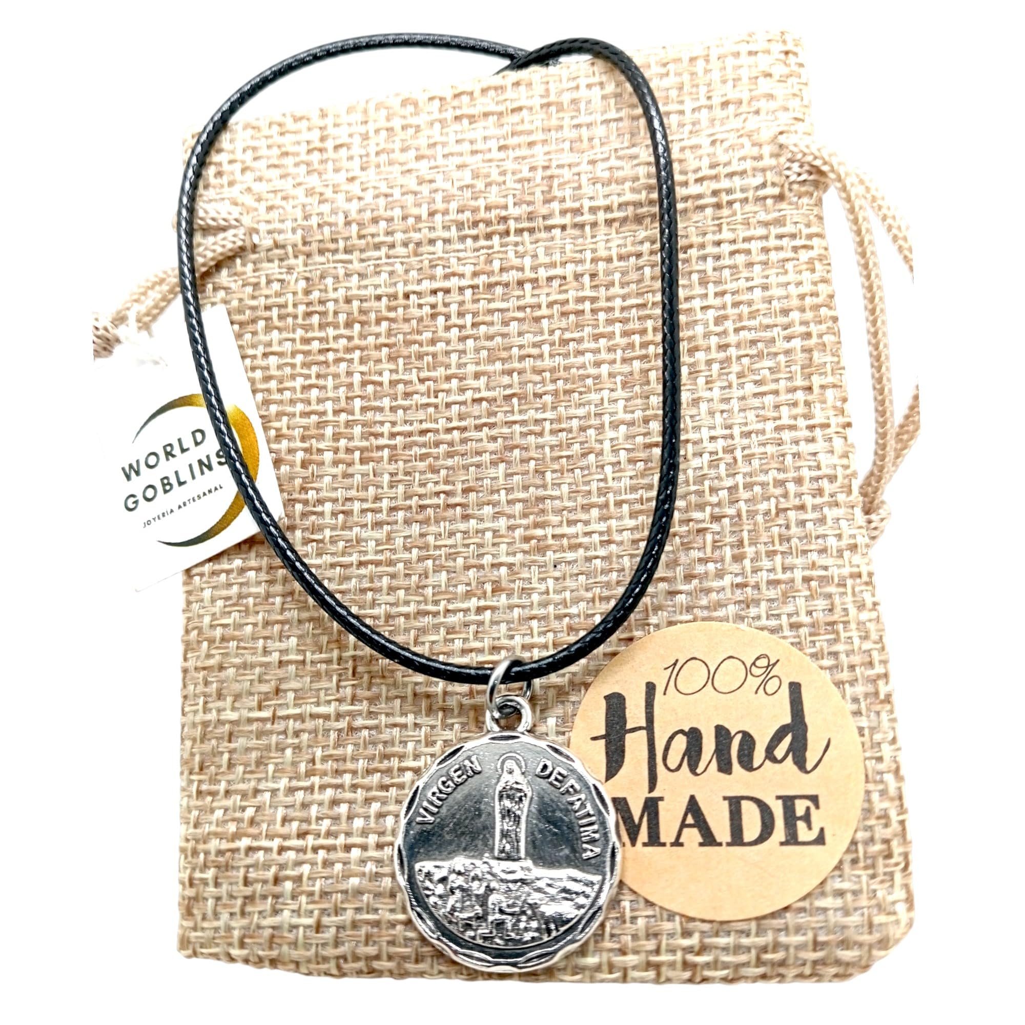 Detalles: Collar Virgen de Fátima con medalla chapada en Plata 925 (12 micras) y cadena cola de ratón negra de 45cm ajustable a 48cm. Una joya espiritual para proteger y acompañar cada día. Ideal para hombre y mujer. Se entrega en bolsa de yute artesanal, perfecta para regalo.