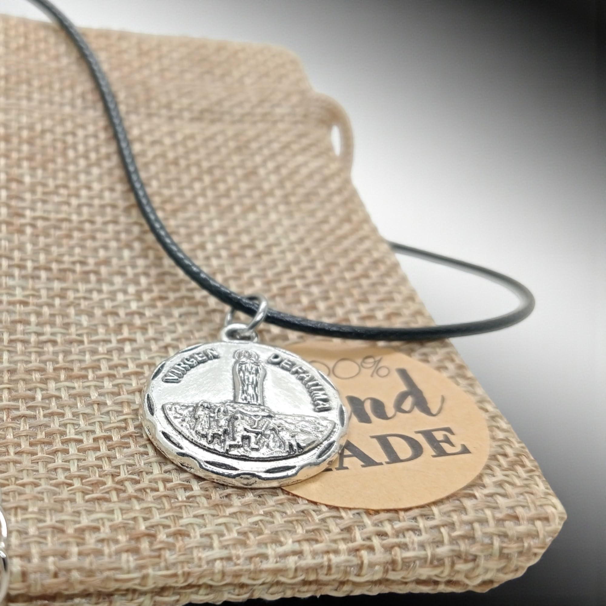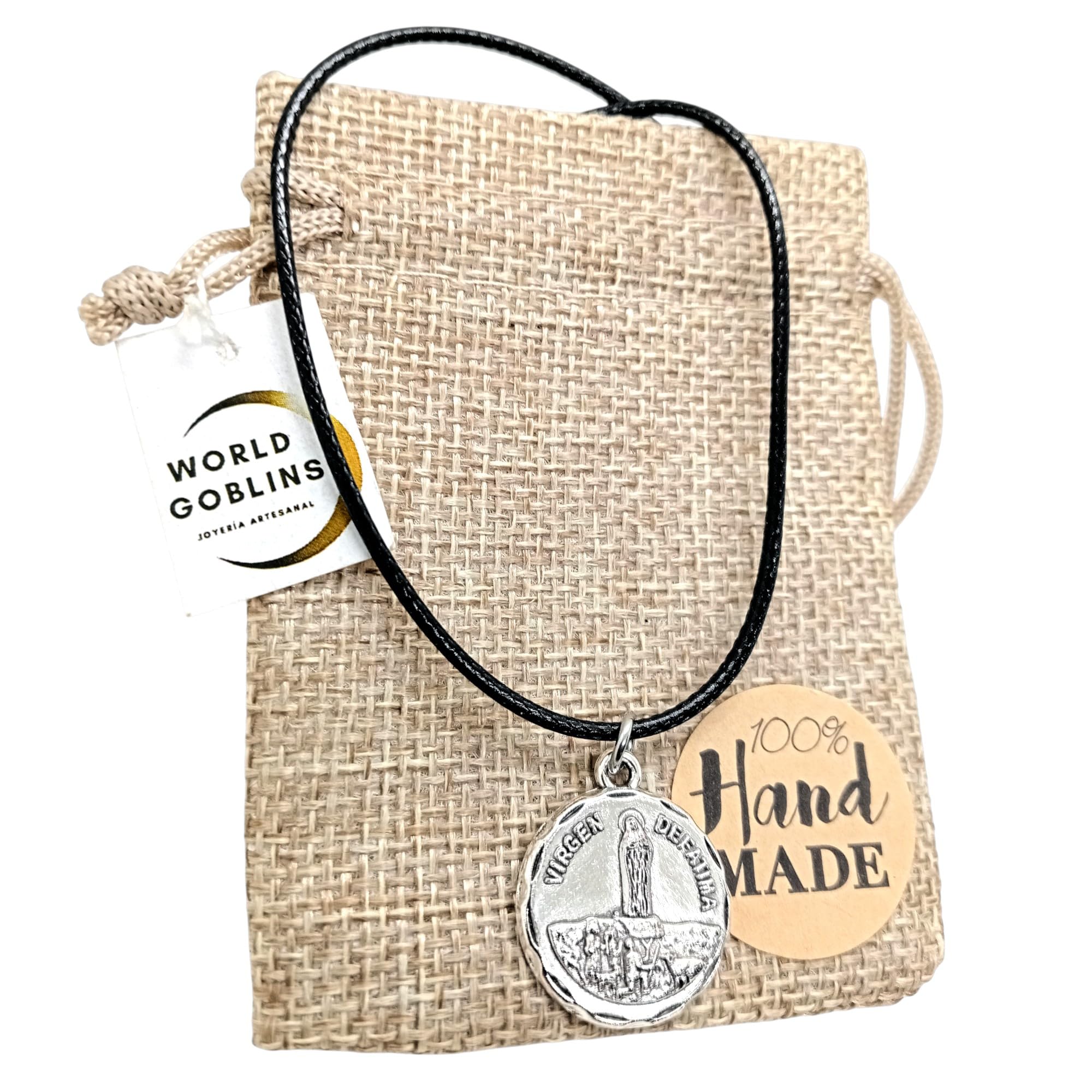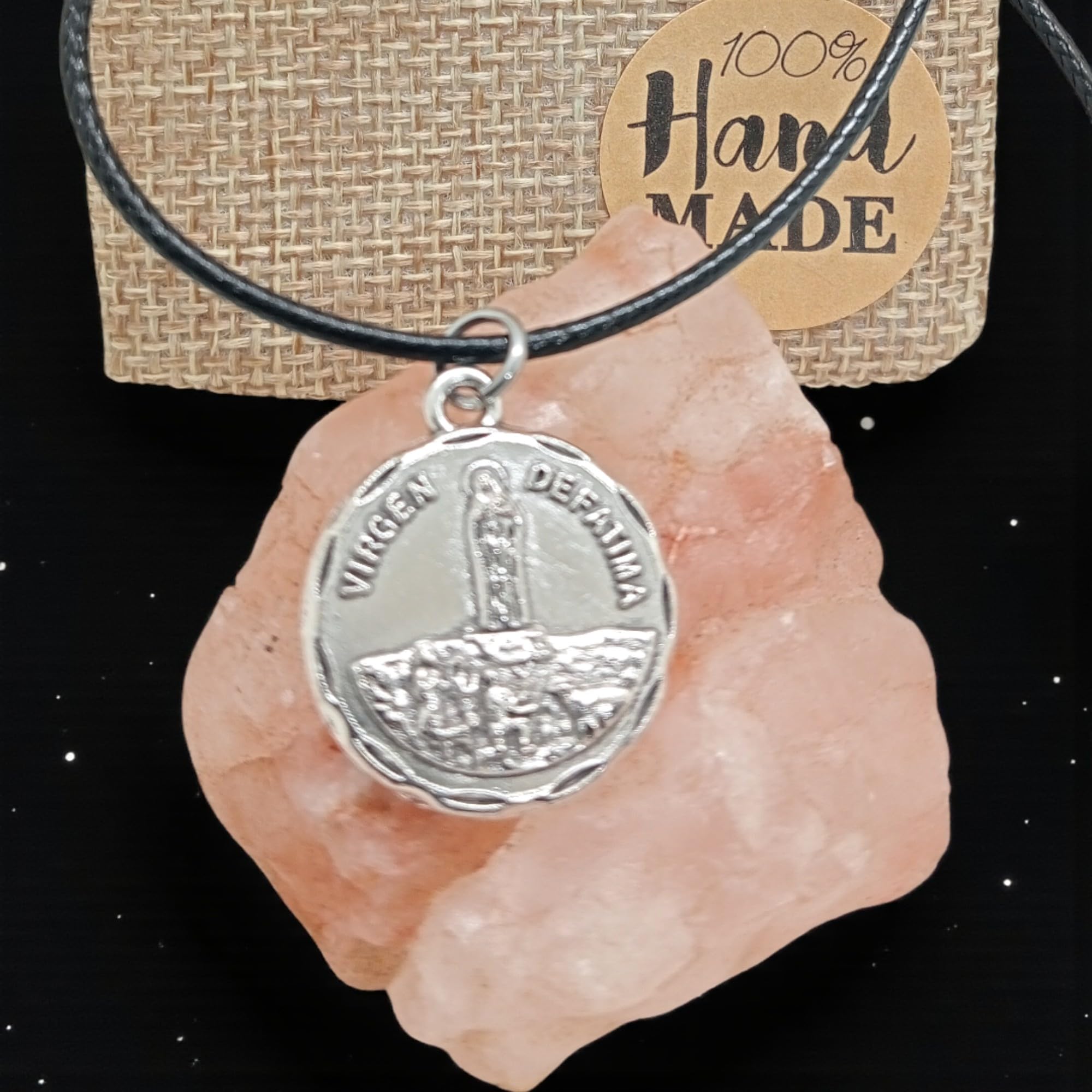 Detalles: Collar Virgen de Fátima con medalla chapada en Plata 925 (12 micras) y cadena cola de ratón negra de 45cm ajustable a 48cm. Una joya espiritual para proteger y acompañar cada día. Ideal para hombre y mujer. Se entrega en bolsa de yute artesanal, perfecta para regalo.