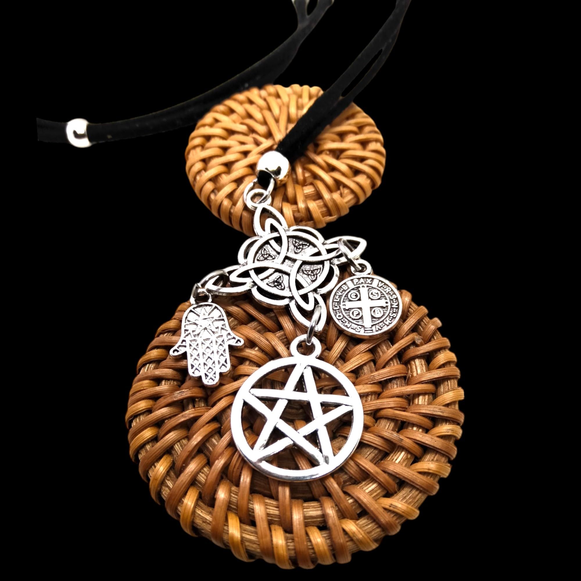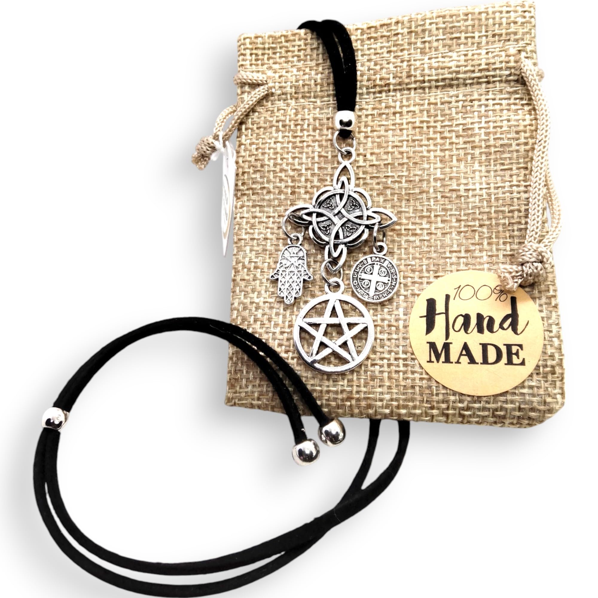 • 🌟CUATRO AMULETOS DE PODER Incluye el Nudo de Bruja, Estrella de David, Medalla de San Benito y Mano de Fátima, cada uno cargado de significado y protección espiritual