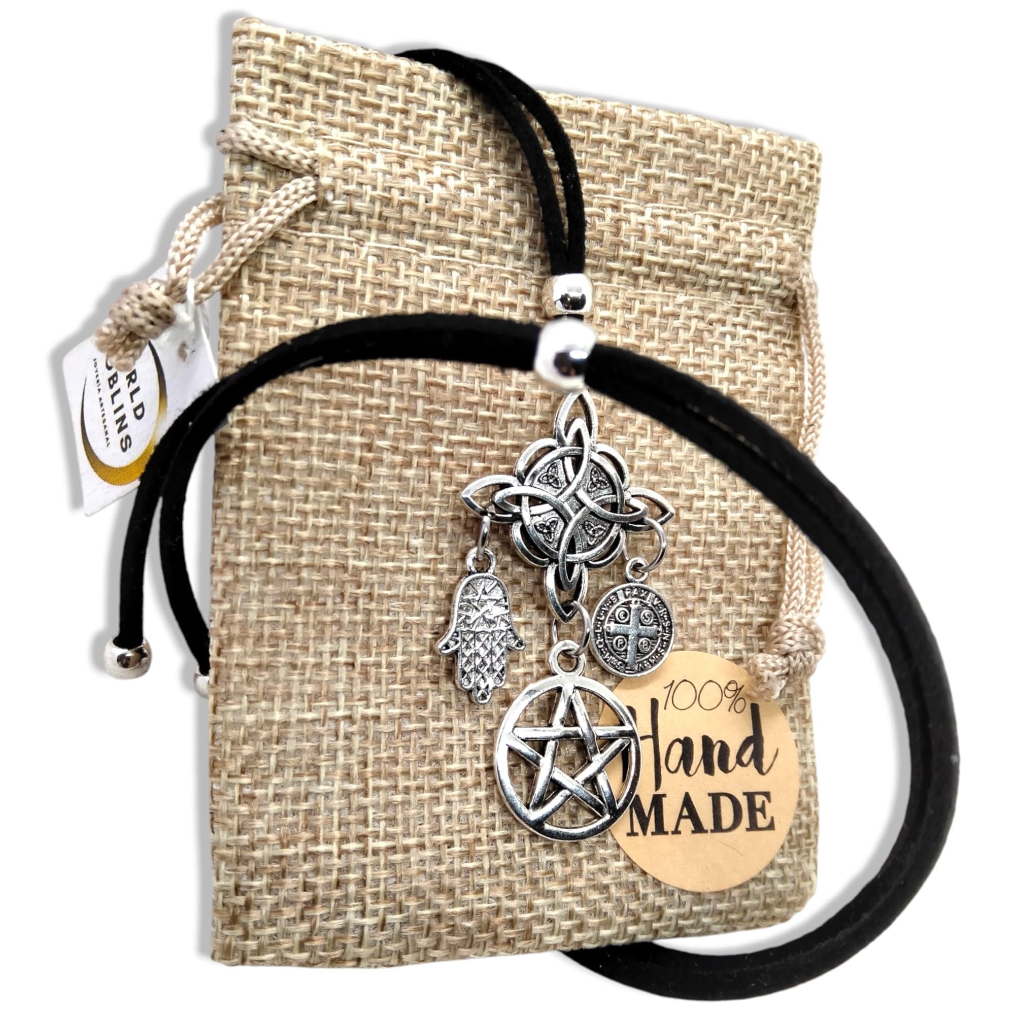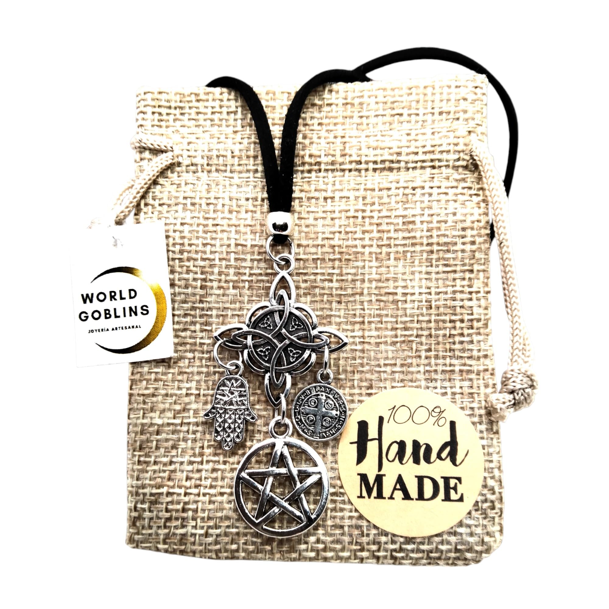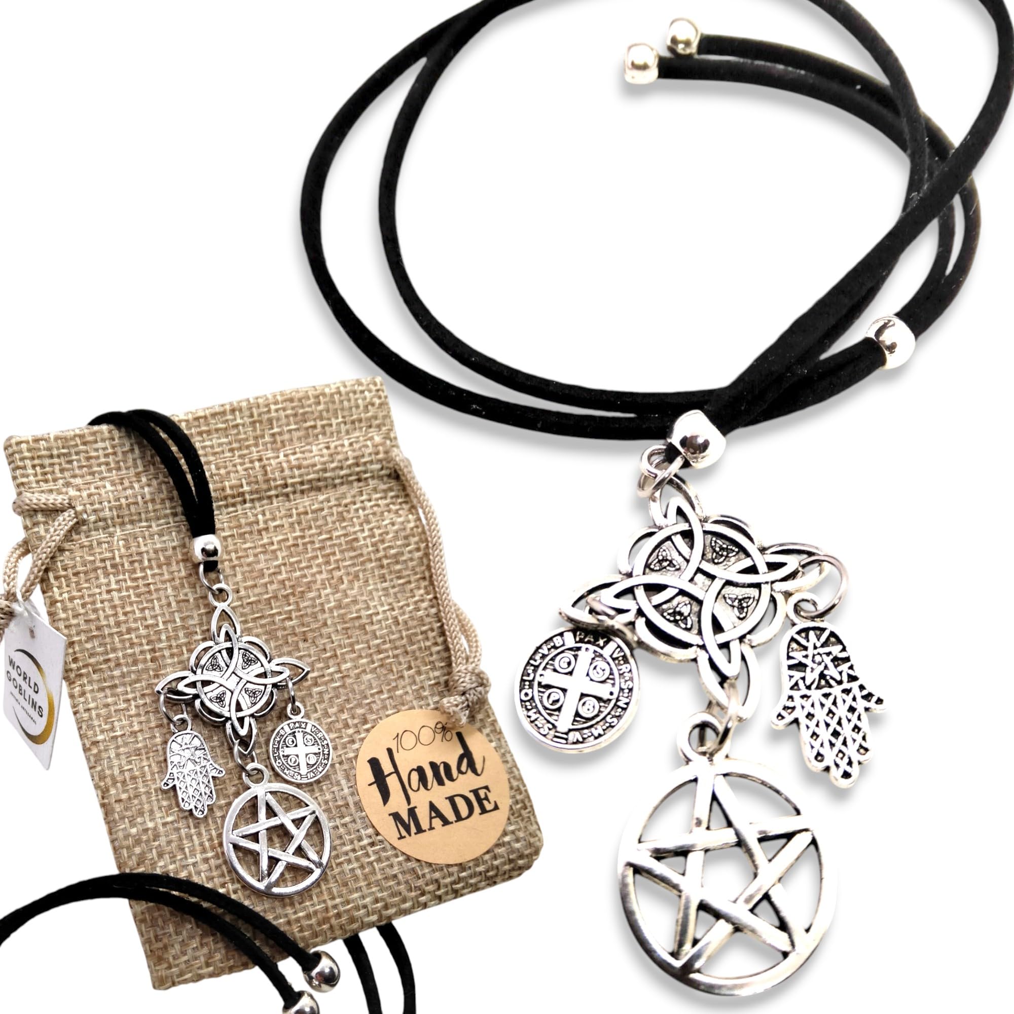 GOBLINS Collar Amuleto Protección Hechizos, Nudo de Bruja, Estrella de David, San Benito y Mano de Fátima, Cuatro Amuletos Potectores, Joyería Espiritual Wicca, Regalos Originales (Protección Total)