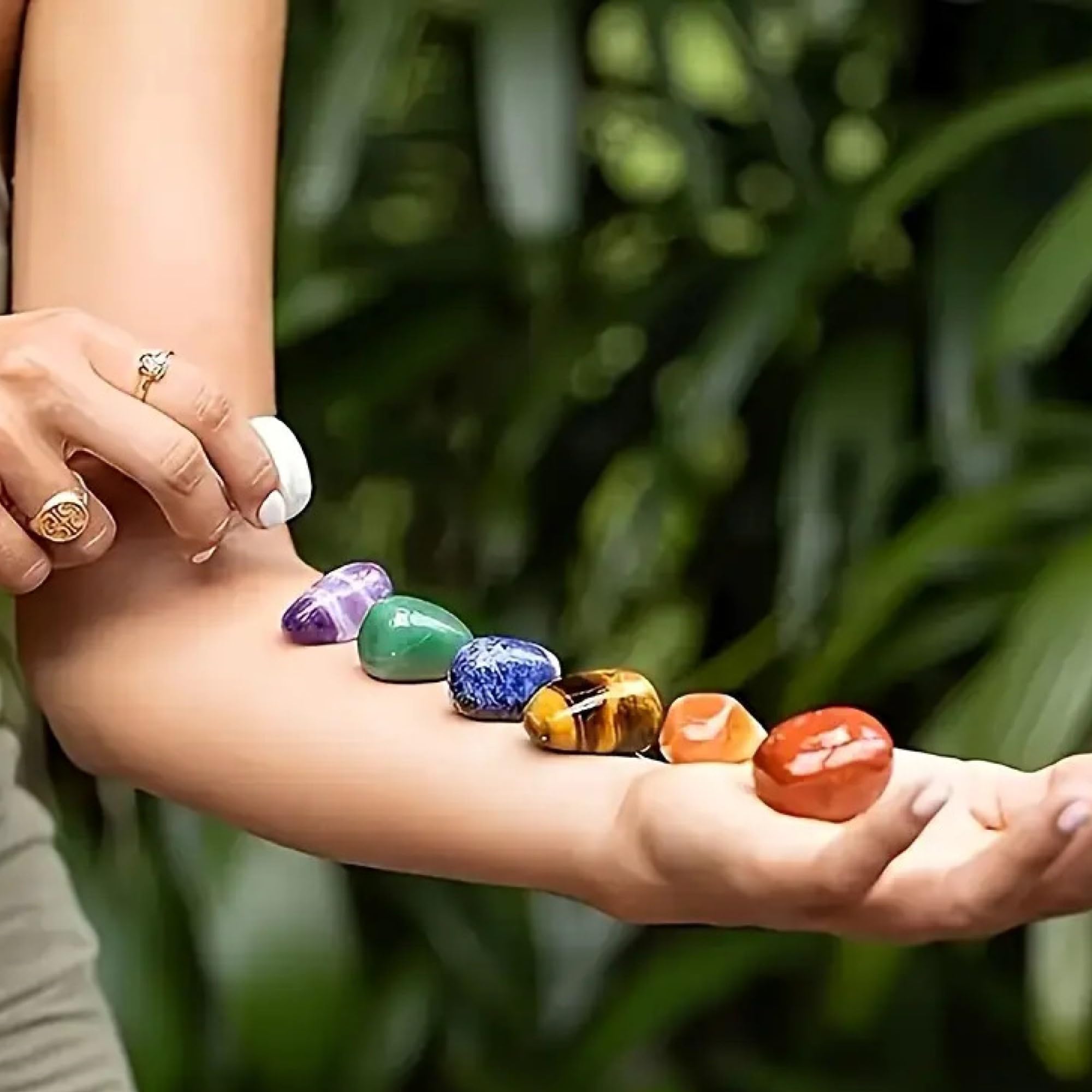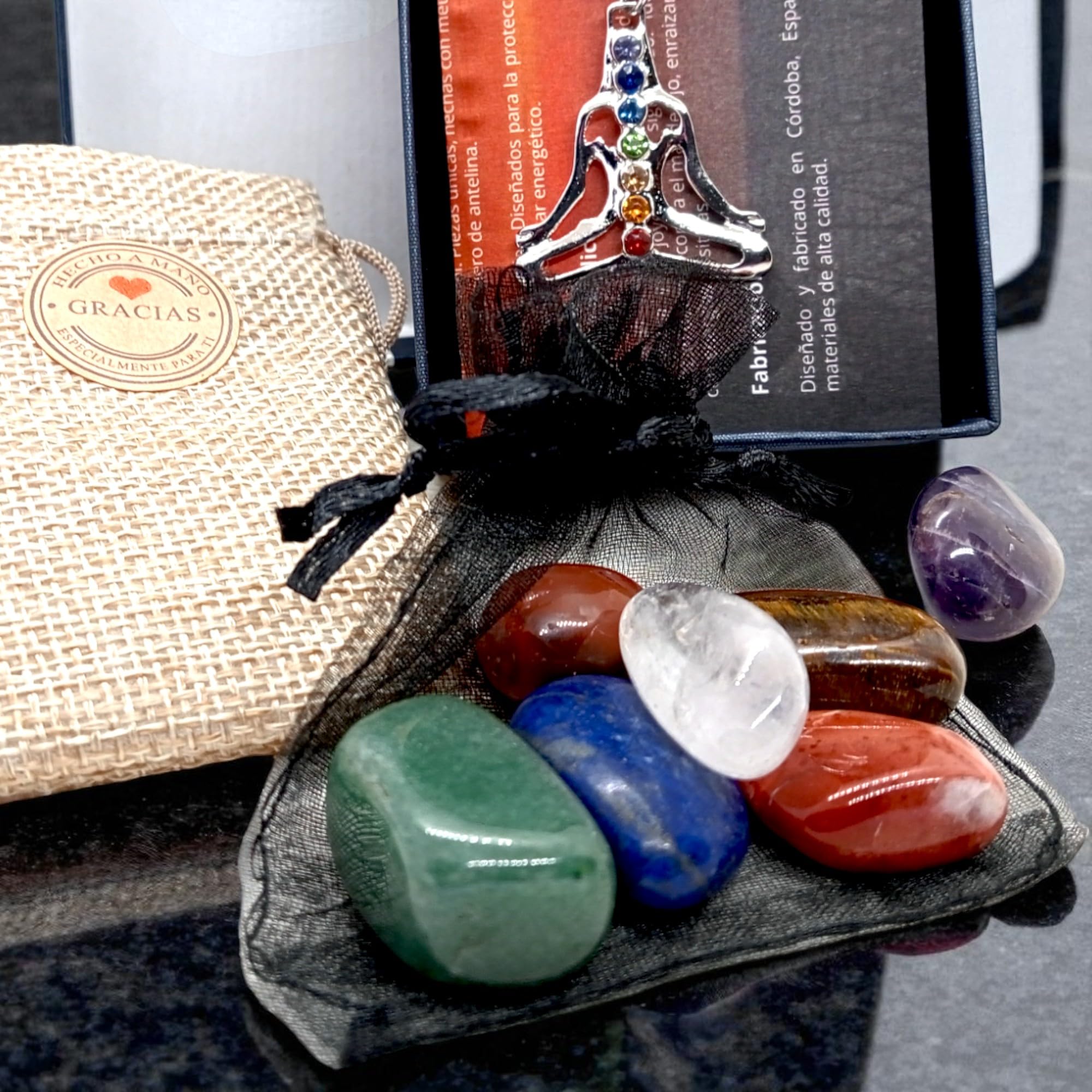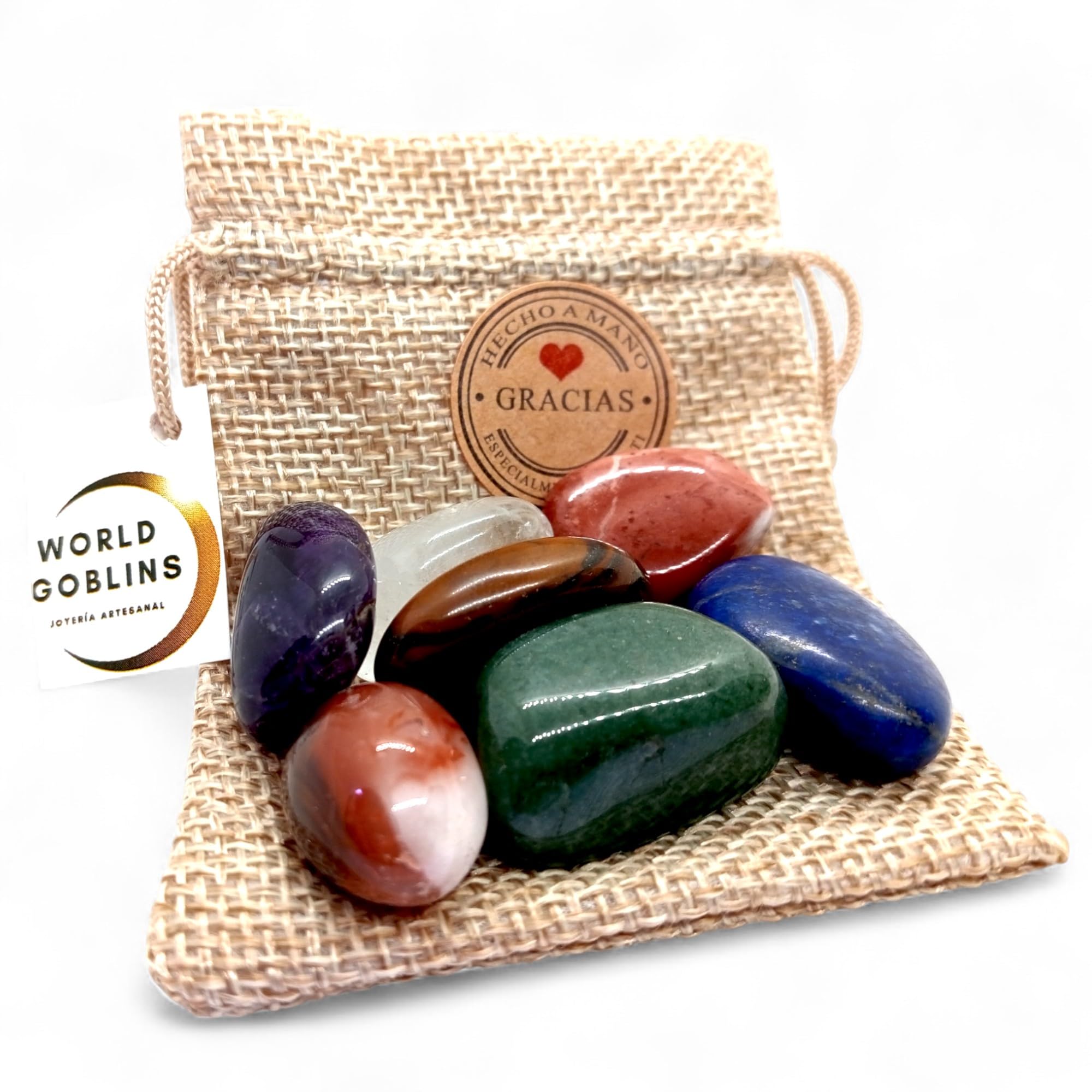 Un completo kit de 7 piedras energéticas: Jaspe rojo, carneola, ojo de tigre, amatista, aventurina verde, cuarzo blanco, lapislázuli y cristal de roca.