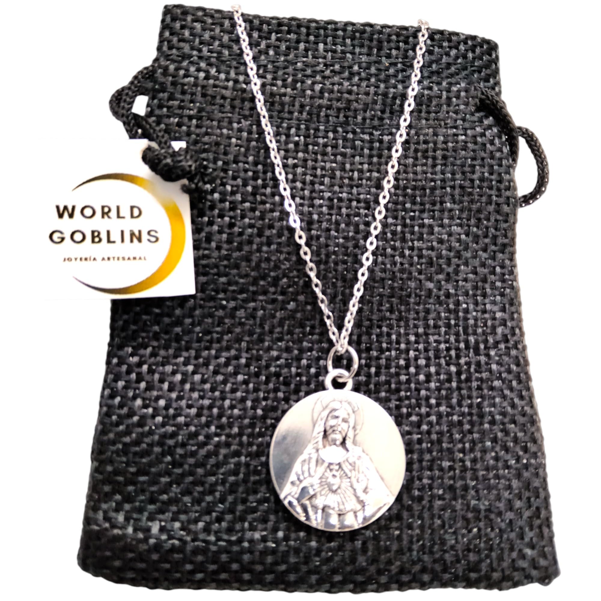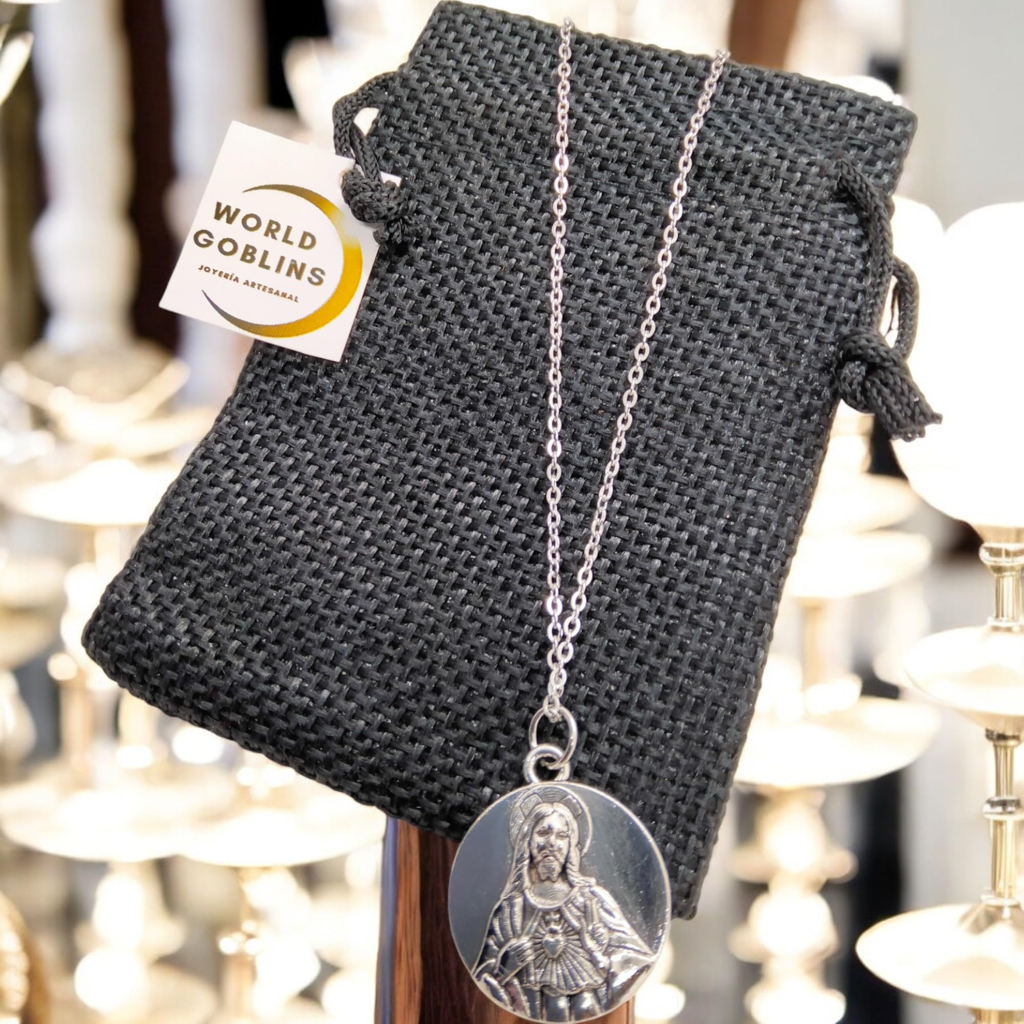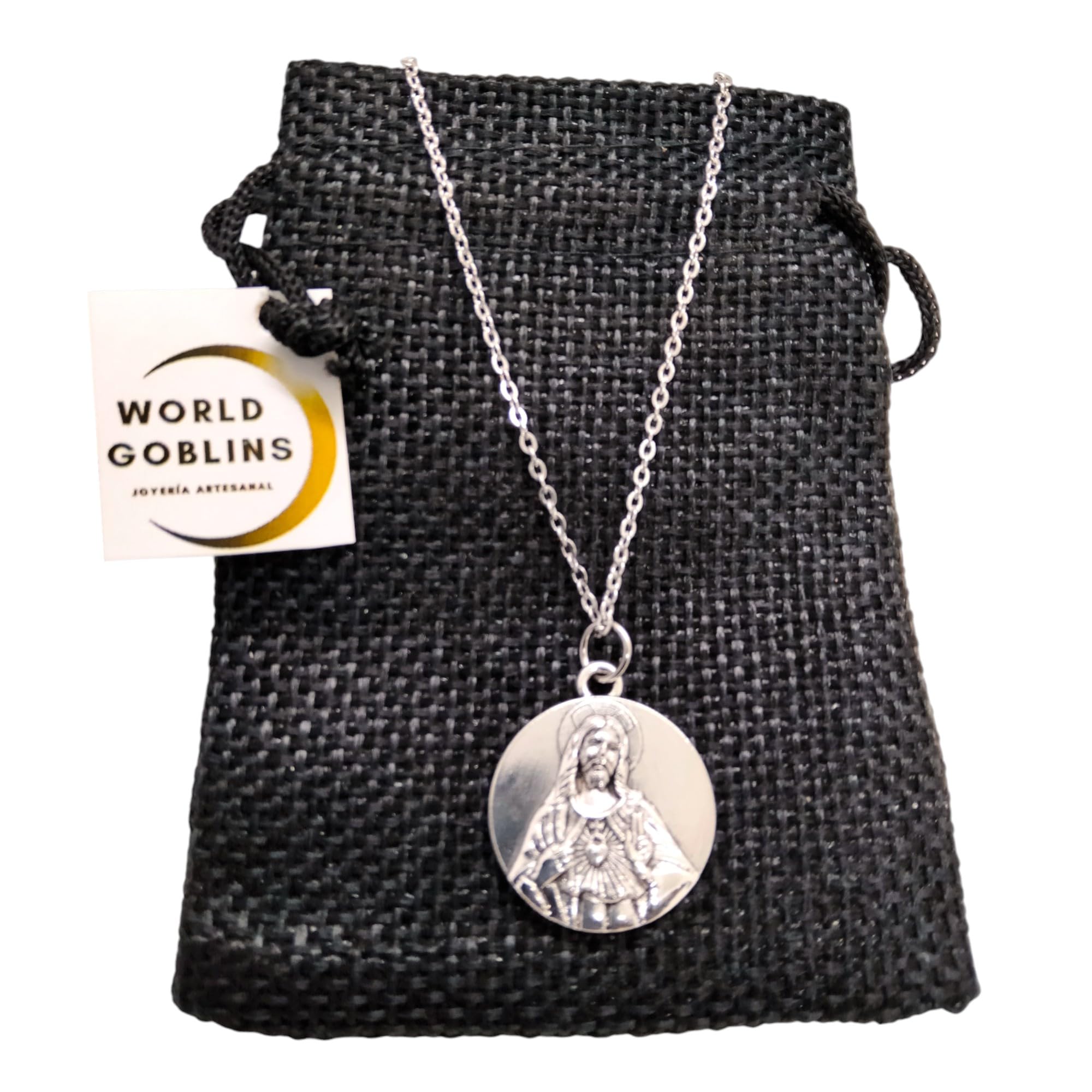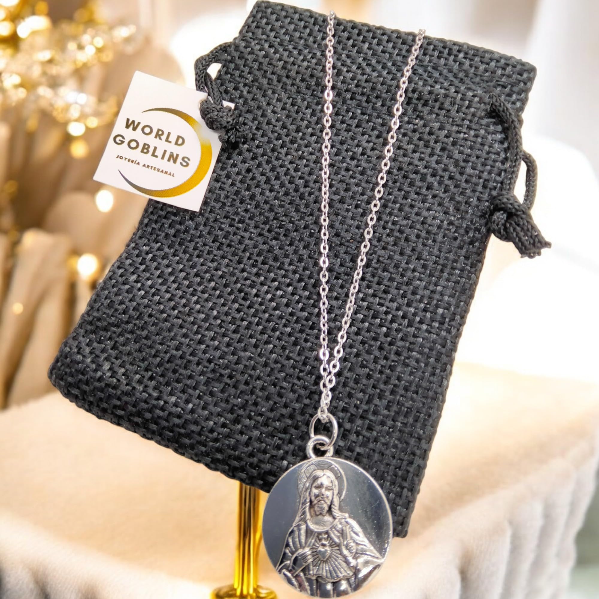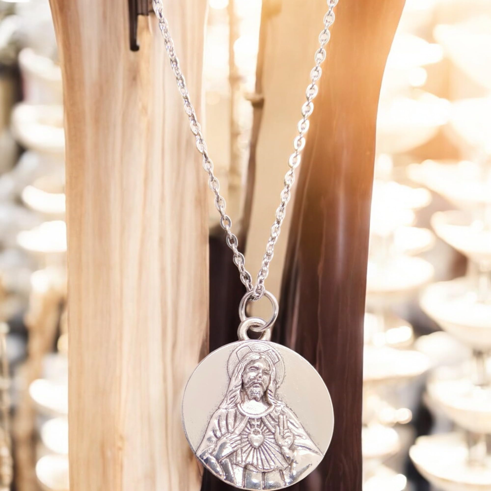 1 COLLAR con Colgante de Medallón de Nuestro Padre Corazón de Jesús. Gargantilla Protección con Cadena de Acero Inoxidable 45 centímetros ajustable a 48