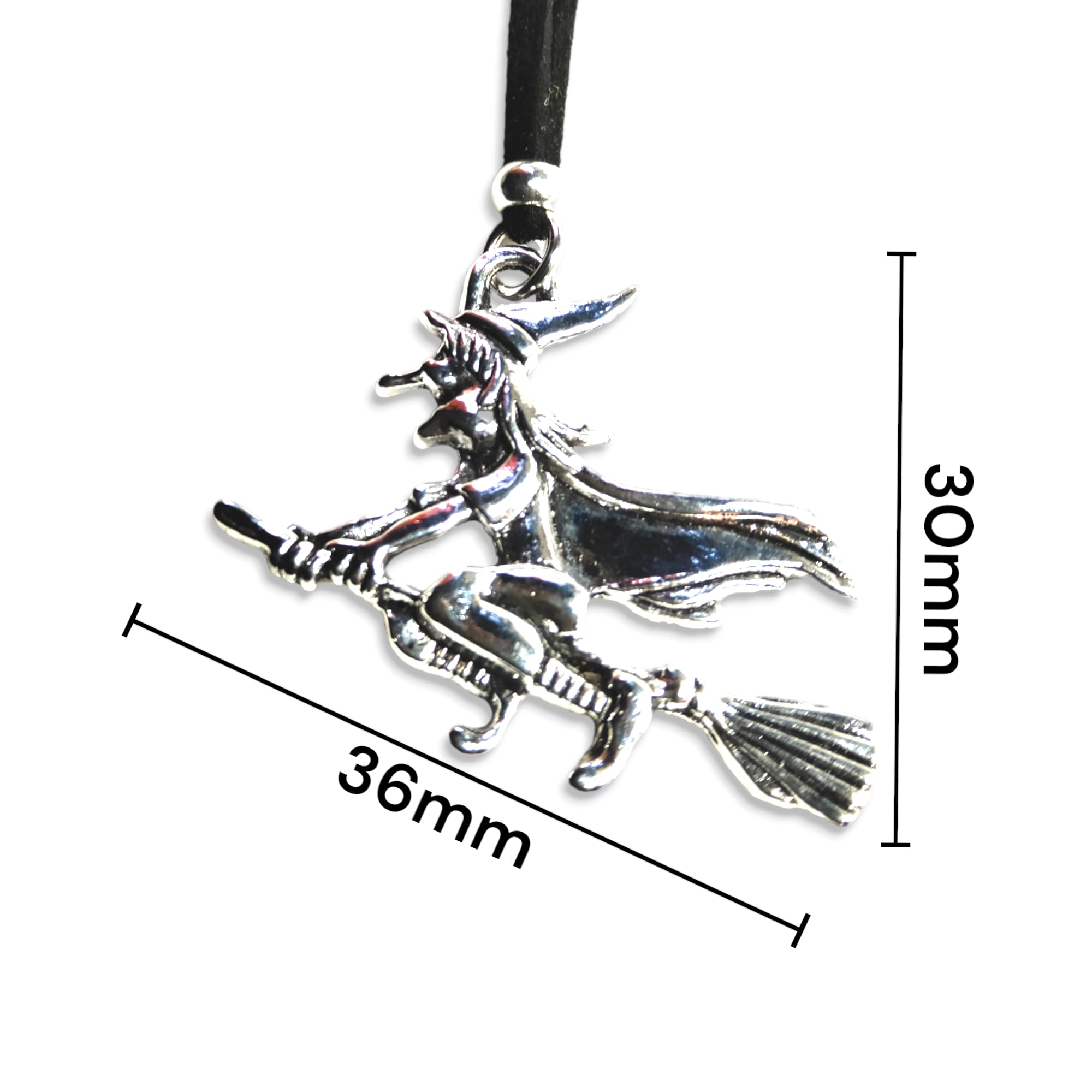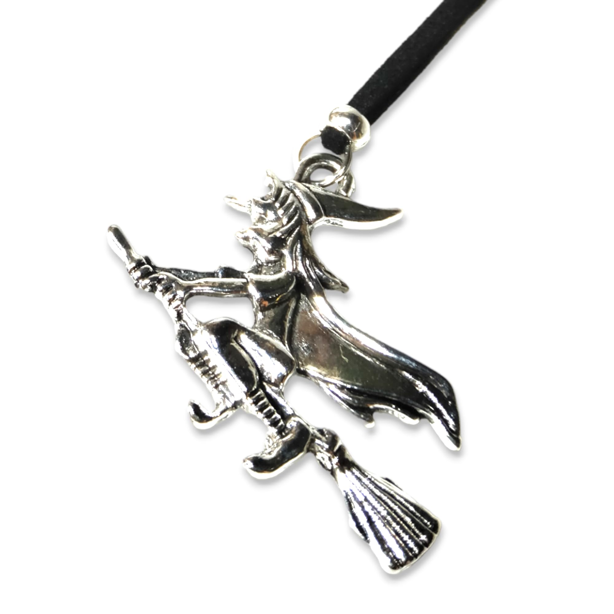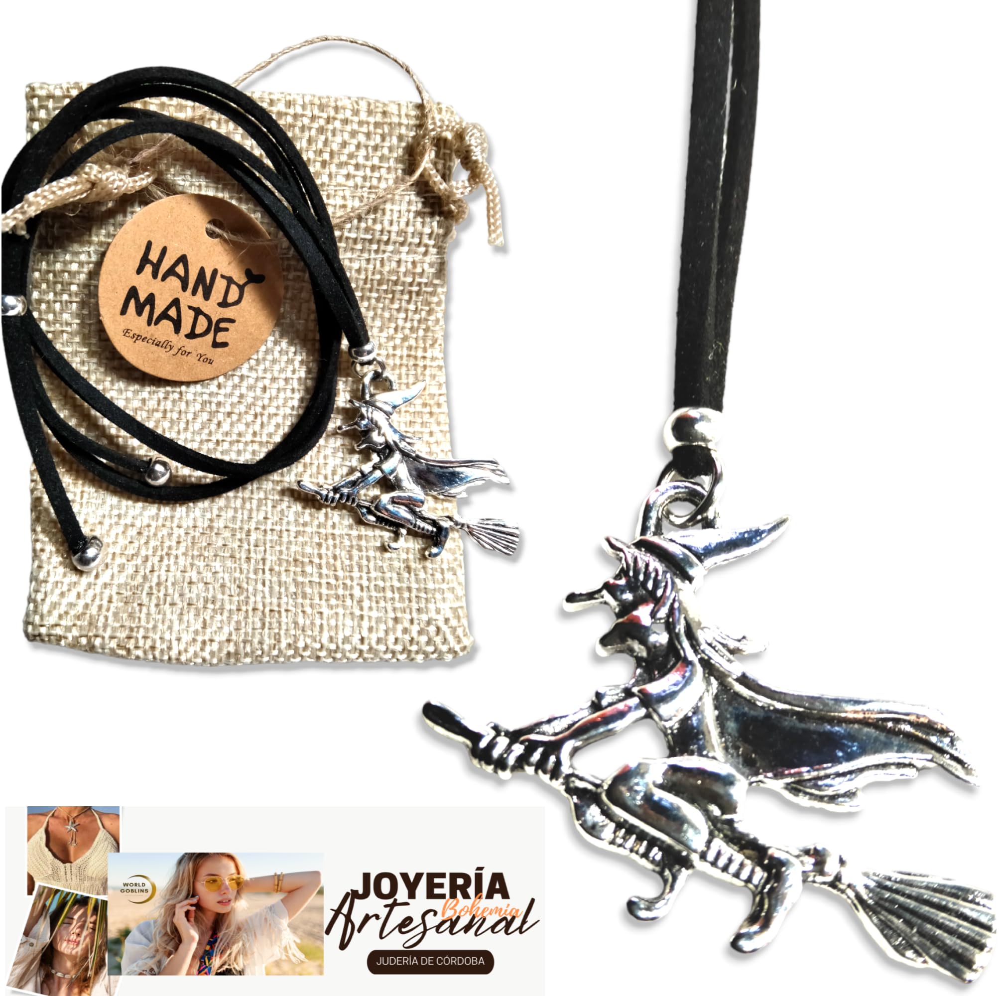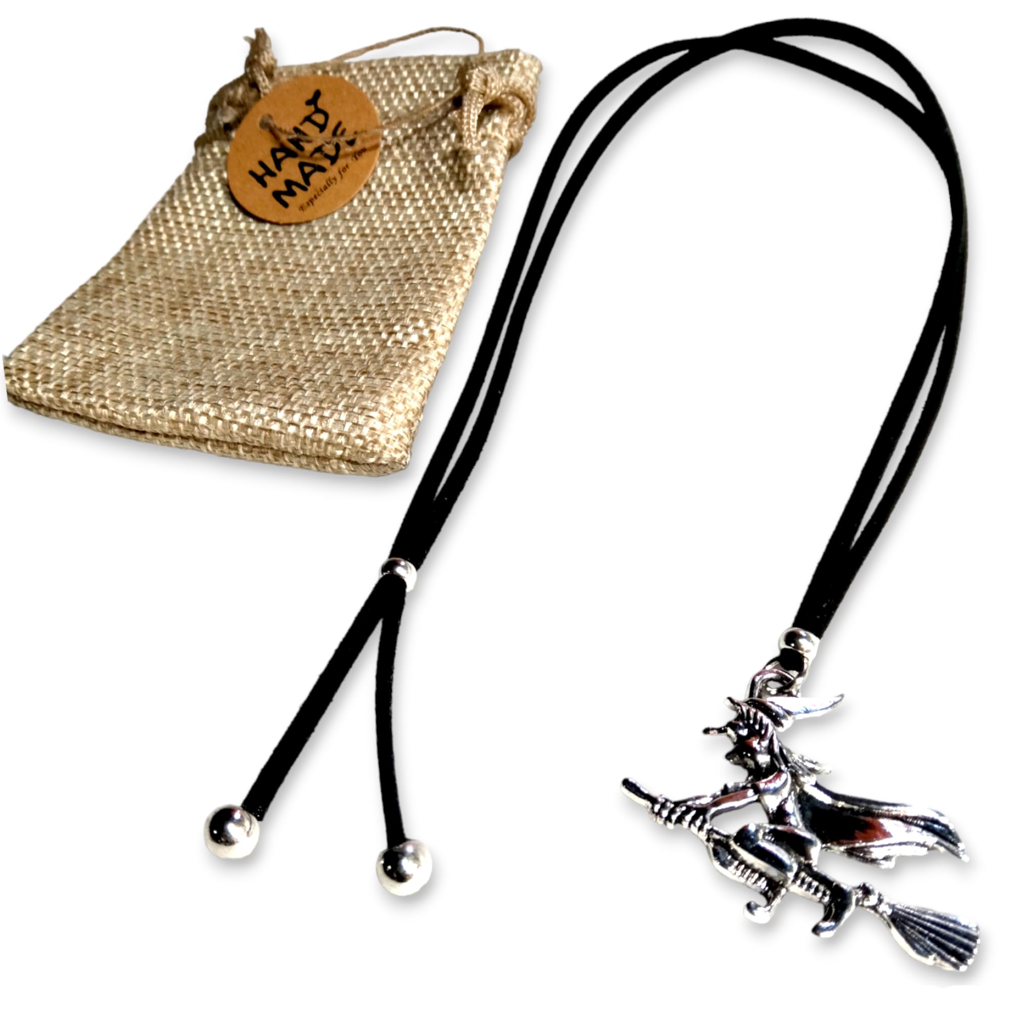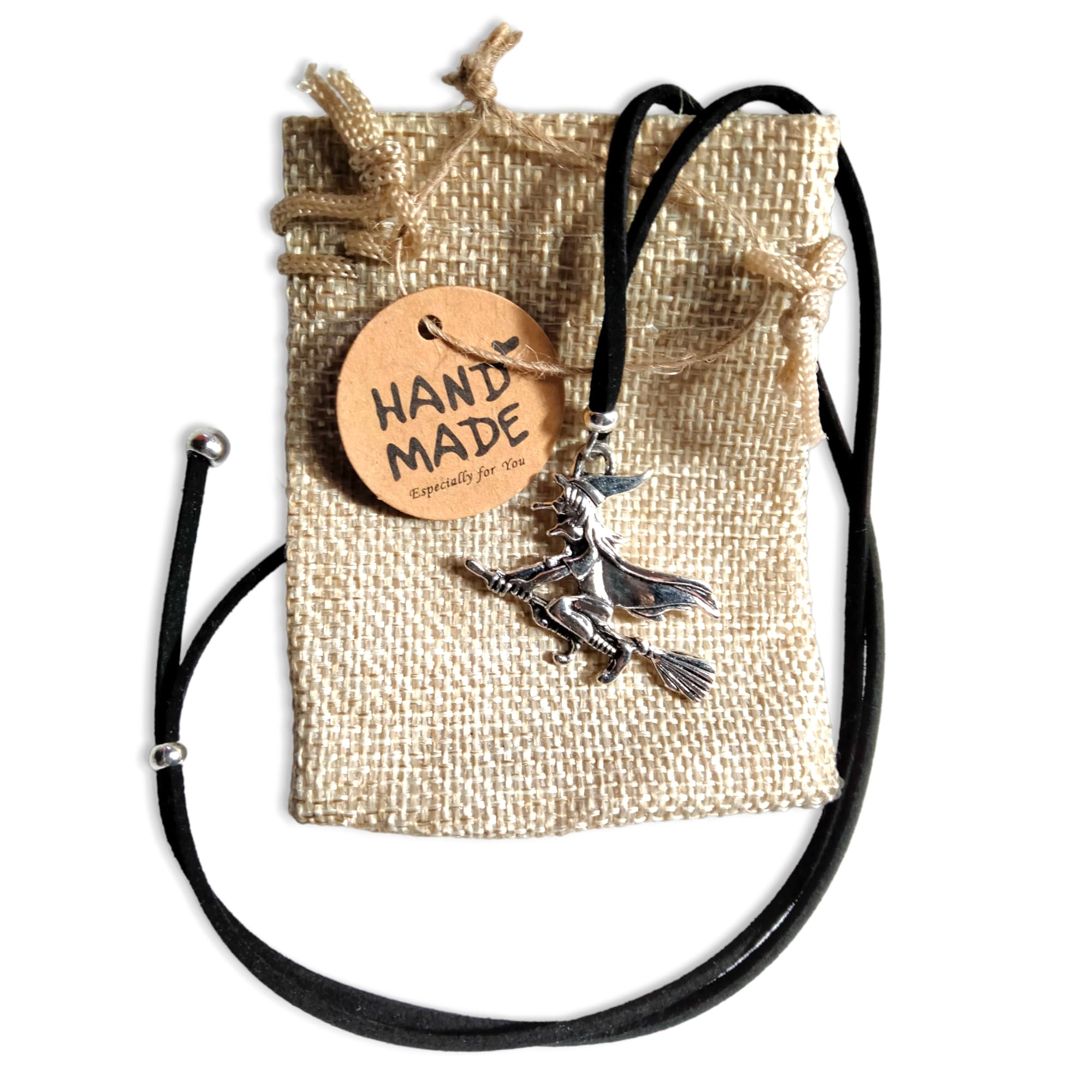 WORLD GOBLINS Collar Nudo de Bruja Amuleto Plata | Antelina Negra 50cm Adaptable para Hombre y Mujer | Amuleto | Protección contra Hechizos + Bolsa de Yute Hecha a Mano Regalo (Bruja Relieve)