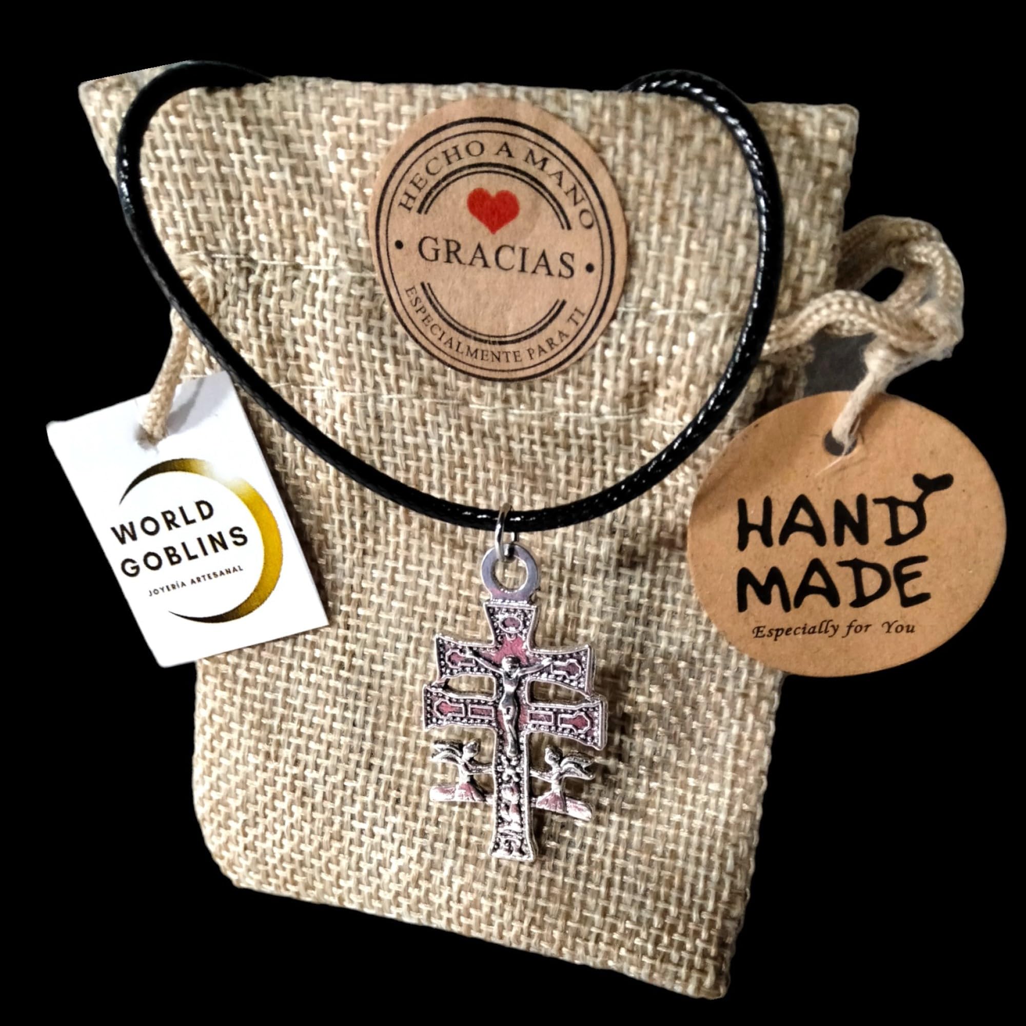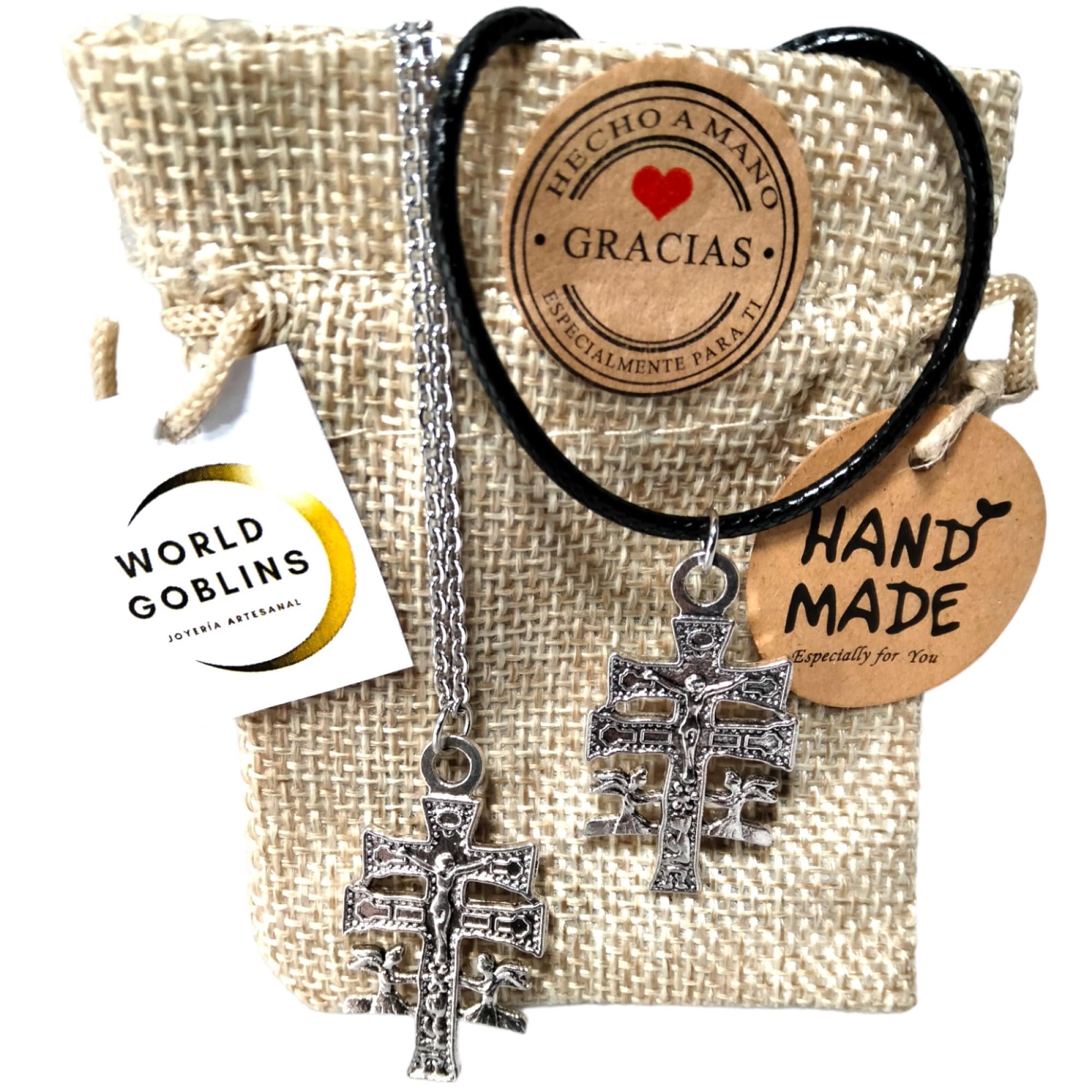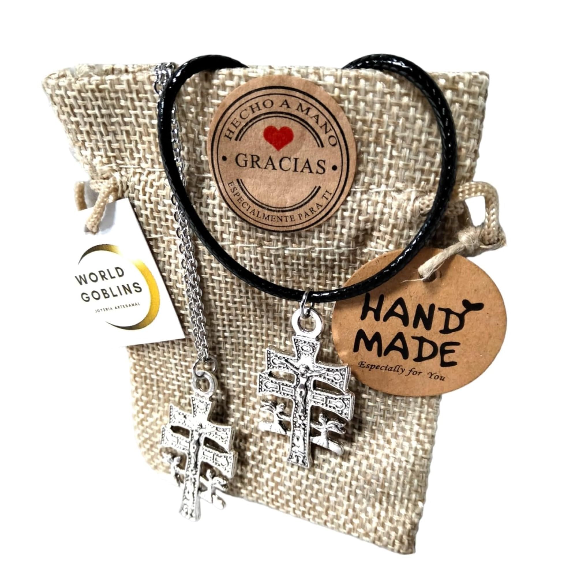 Detalles: La Cruz de Caravaca tiene múltiples significados: representa el cristianismo, la fe en Jesucristo y es una reliquia de la cruz donde murió. También se considera un potente amuleto de protección contra el mal, las energías negativas y los peligros, y se le atribuyen propiedades milagrosas y mágicas. Además, su forma simboliza la unión del plano espiritual y material. ¡No esperes más! Añade estos impresionantes collares a tu colección hoy mismo. Haz clic en «Añadir al carrito» y lleva contigo un pedacito de protección y elegancia. Hechas a mano en España , nuestras joyas no solo embellecen, sino que también protegen y aportan suerte. ¡Regala o luce estas piezas únicas y siente la diferencia!