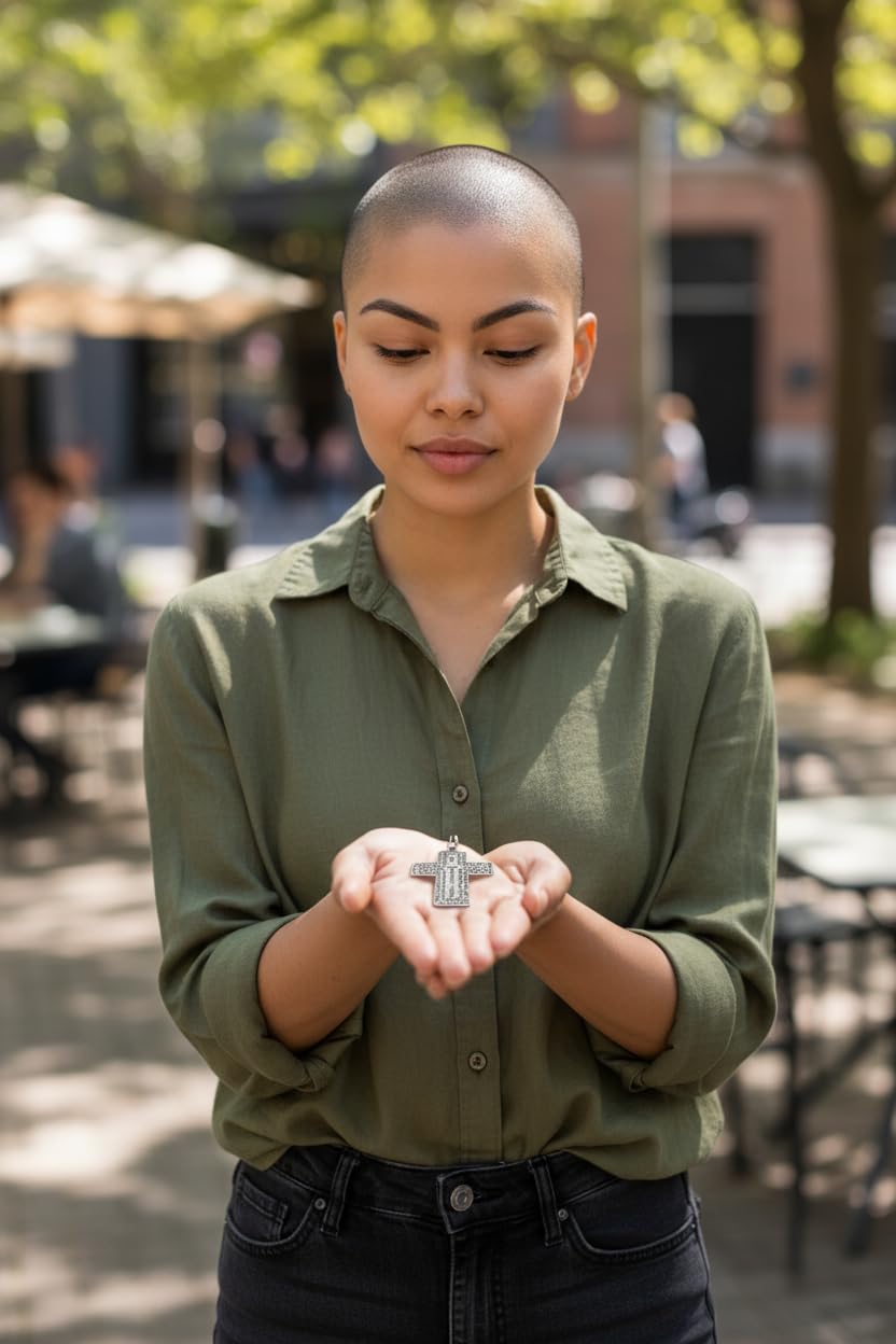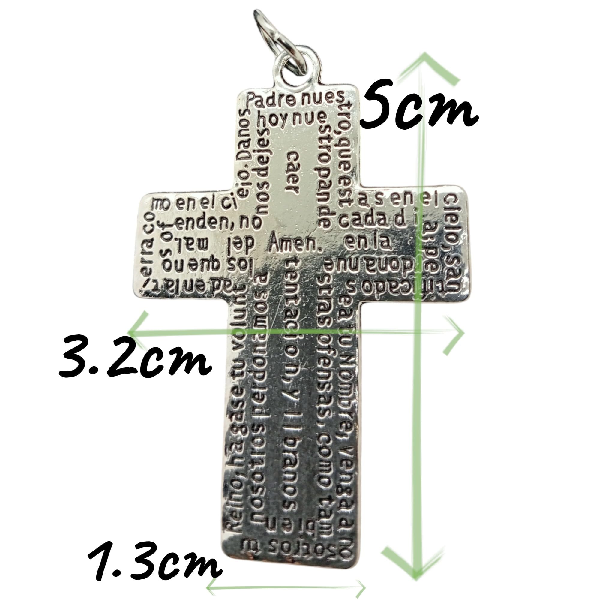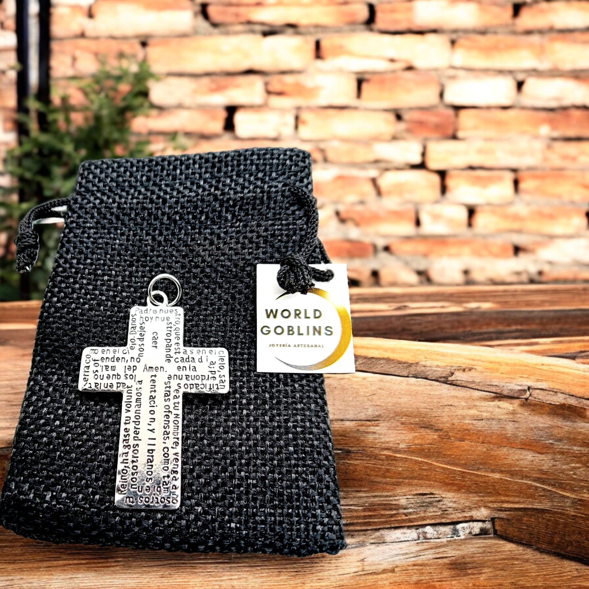 Detalles: Cruz cristiana de gran tamaño con el Padre Nuestro en relieve, símbolo de fe, protección y devoción diaria. Tipo: Colgante religioso cristiano Diseño: Cruz con Padre Nuestro en relieve Material: Metal chapado en plata con acabado óxido Medidas: 50 x 32 mm Estilo: Tradicional, devocional, simbólico Presentación: Bolsa de yute artesanal Uso: Diario, ceremonial o regalo religioso