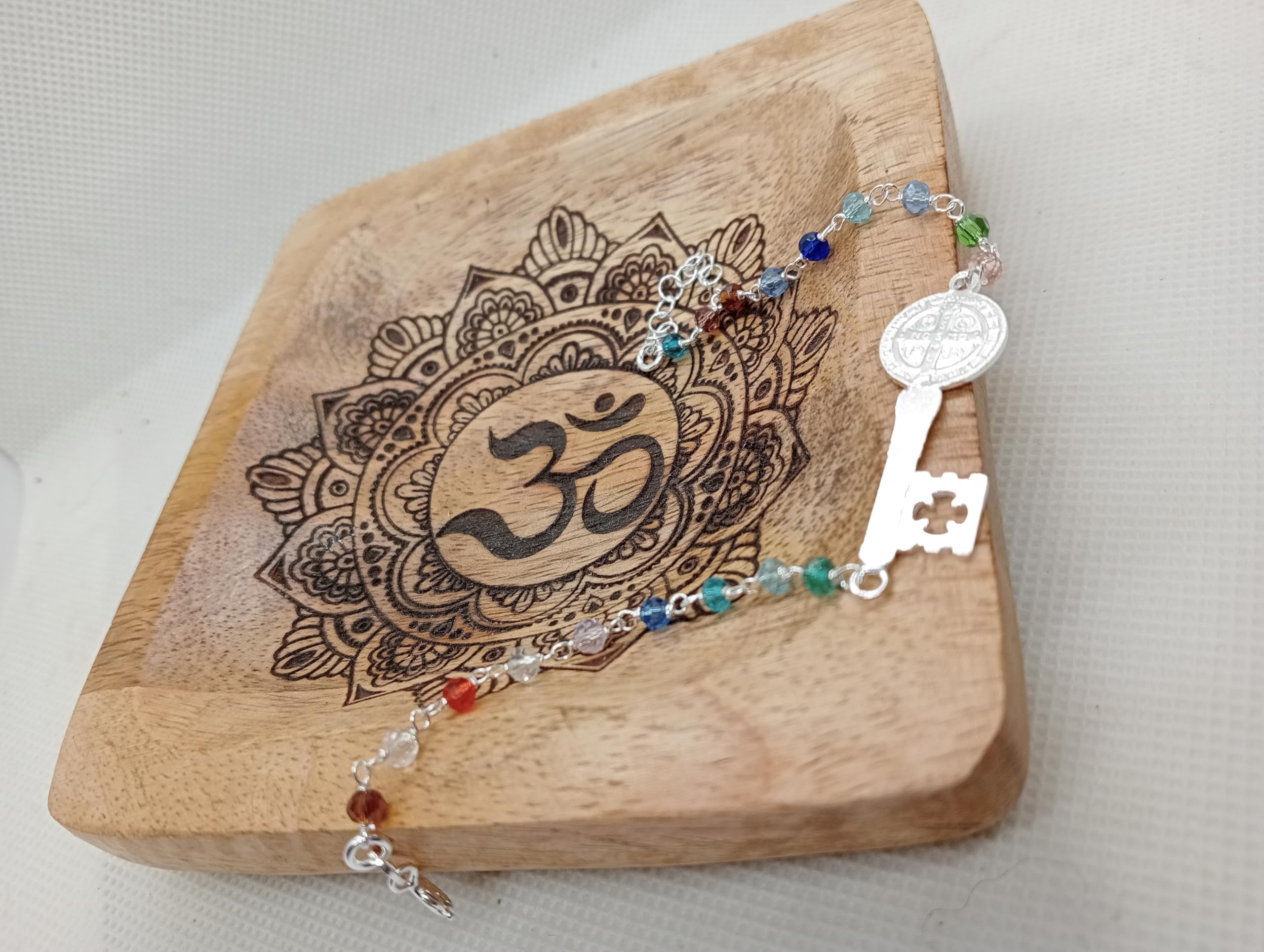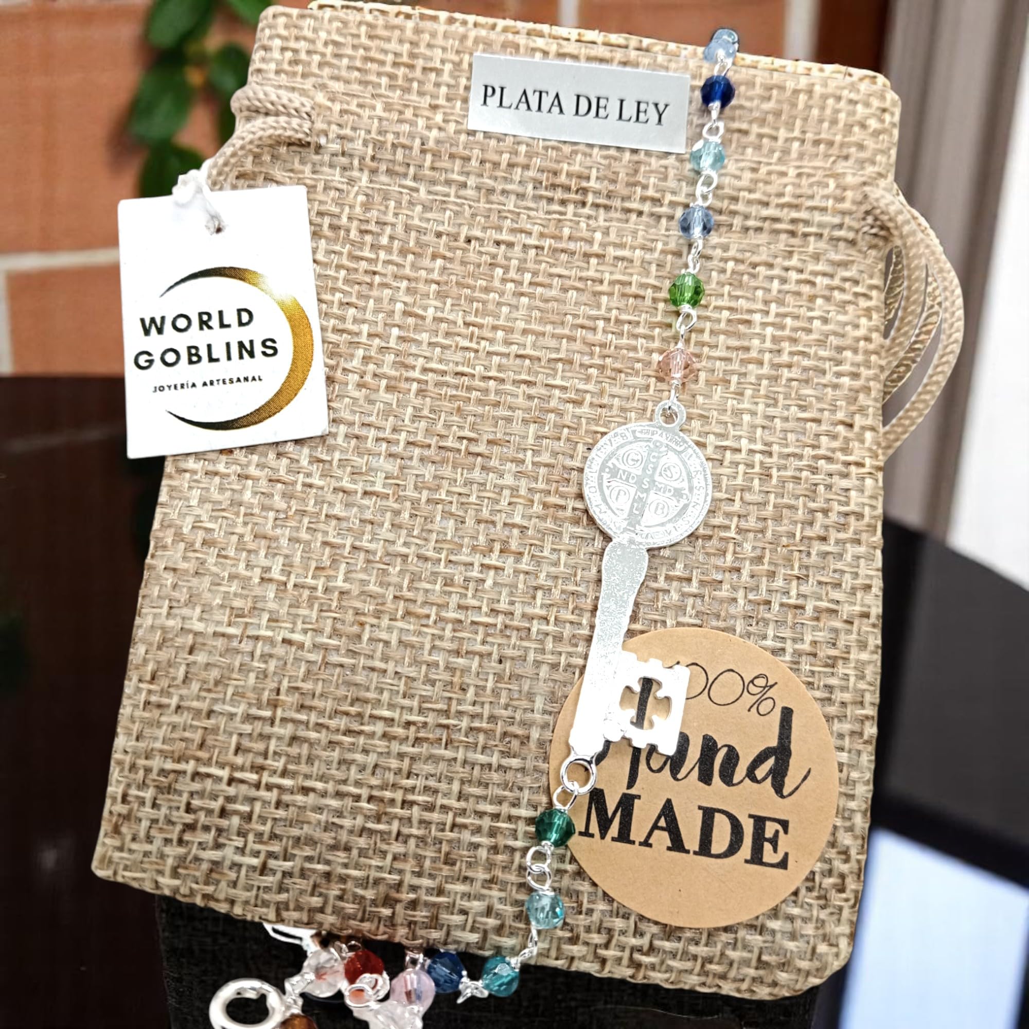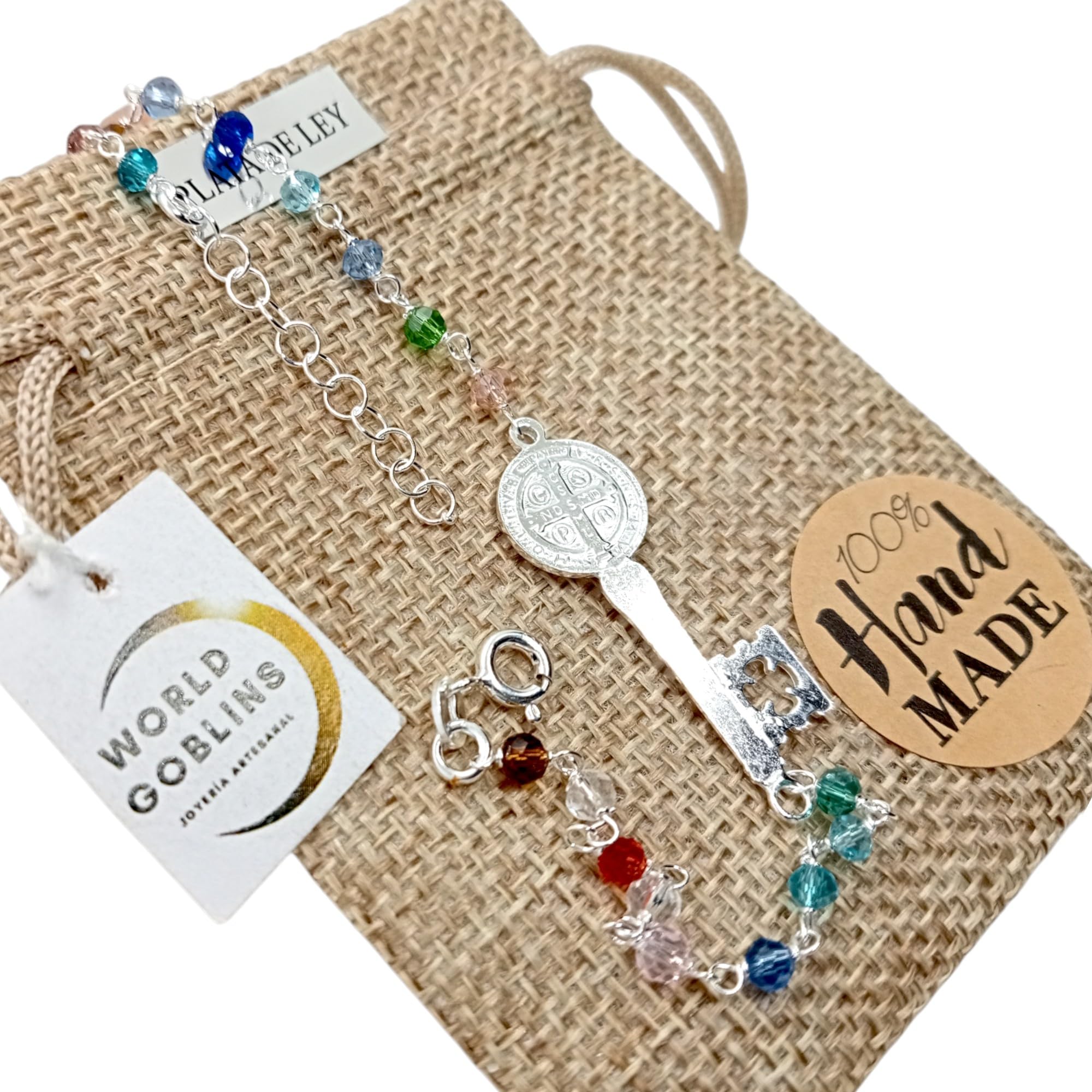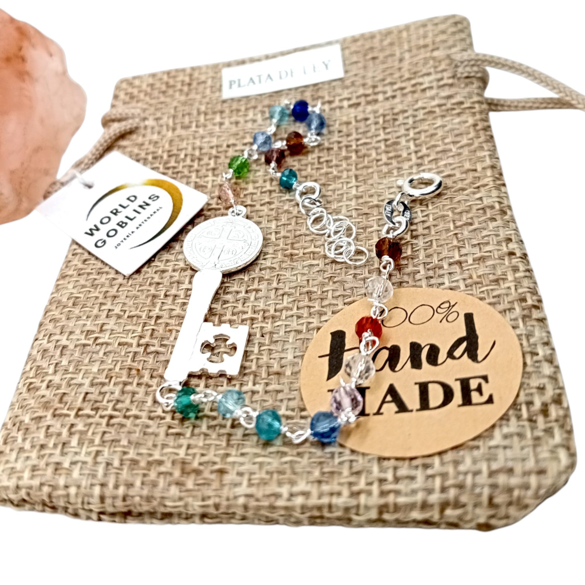 Detalles: Pulsera de Plata de Ley con diseño espiritual y lleno de simbolismo. Incorpora la Llave de San Benito como amuleto de protección, acompañada de 18 piedras naturales de colores que aportan belleza y energía positiva. Una pieza artesanal, hecha a mano en la Judería de Córdoba por WORLD GOBLINS. Ideal como regalo único y significativo, enfocado en la espiritualidad y la defensa energética.