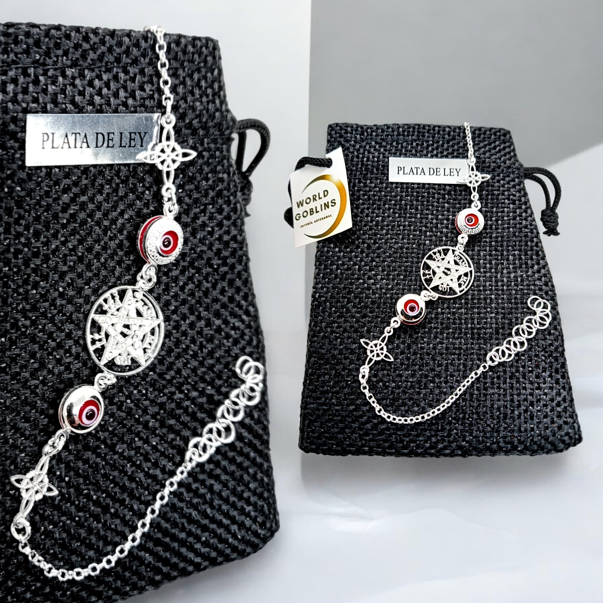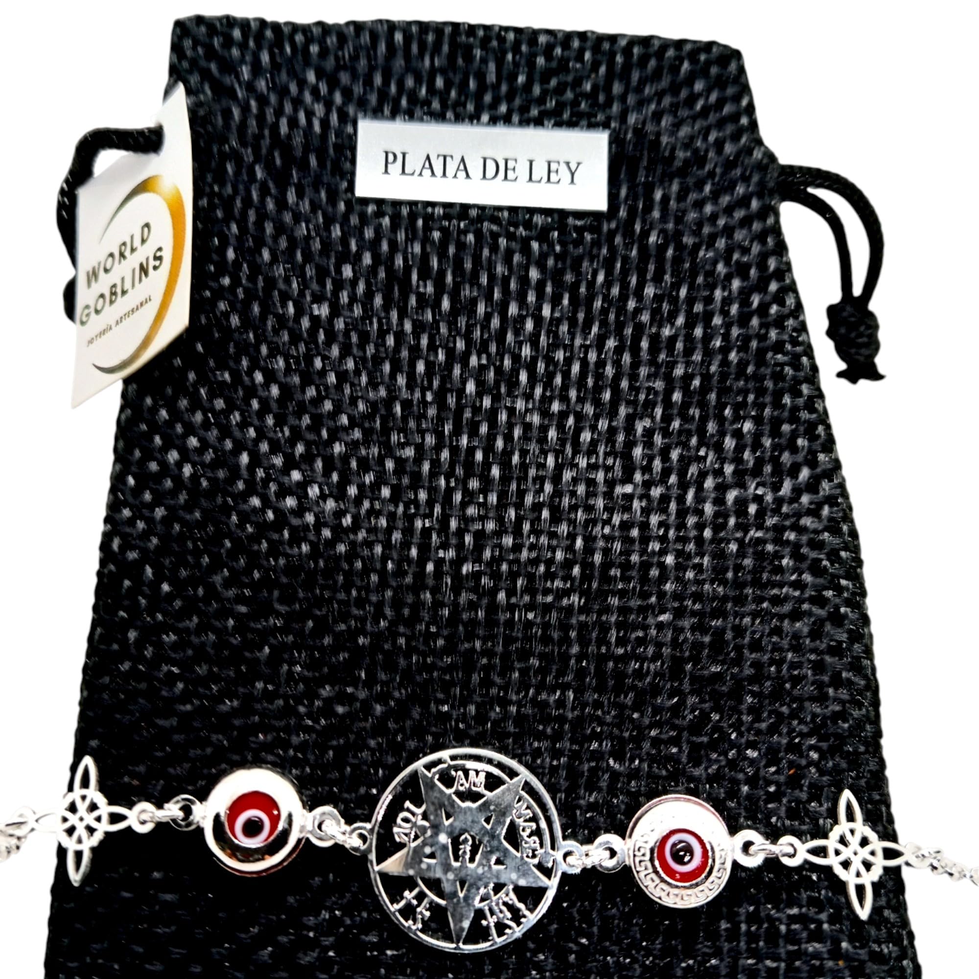 Detalles: Una pulsera creada para mujeres que buscan mucho más que una joya. Esta pieza artesanal de WORLD GOBLINS combina tres de los amuletos protectores más poderosos: el Tetragramatón, el Ojo Turco y el Nudo de Bruja. Fabricada en Plata de Ley 925 contrastada, garantiza calidad, durabilidad y un brillo excepcional.