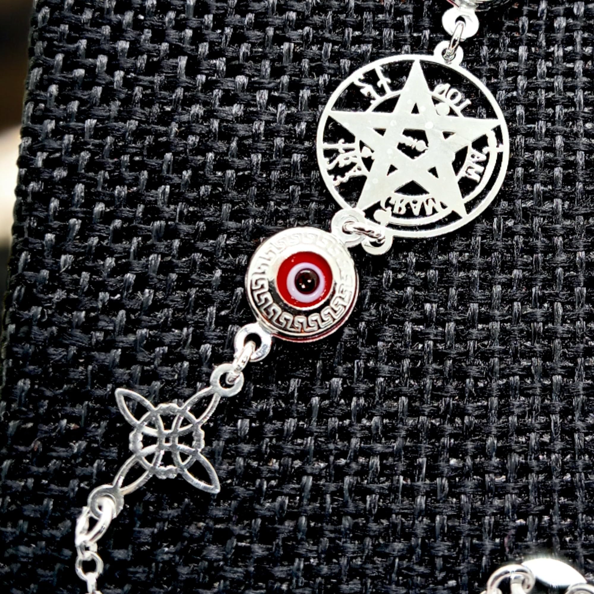- 🧿✨DISEÑO DE PROTECCIÓN COMPLETA Incluye Tetragramatón de 13 mm, 2 Ojos Turcos rojos y 2 Nudos de Bruja: unión de símbolos ancestrales de defensa energética