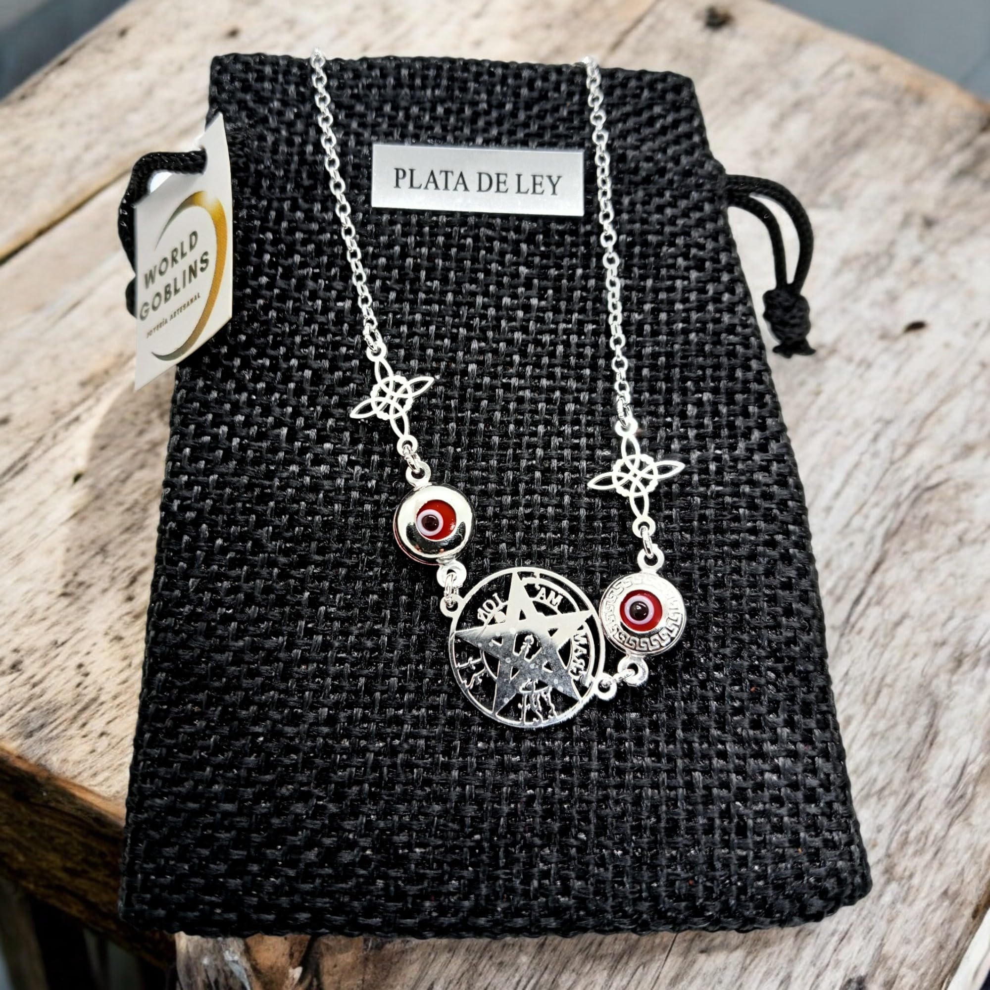 - 🧿✨El Tetragramatón actúa como escudo espiritual, los Ojos Turcos rojos protegen del mal de ojo y los Nudos de Bruja equilibran la energía. El conjunto forma un talismán elegante, femenino y cargado de significado. Diseñada y elaborada a mano en Córdoba, esta joya se convierte en un regalo perfecto gracias a su presentación en bolsa de yute artesanal