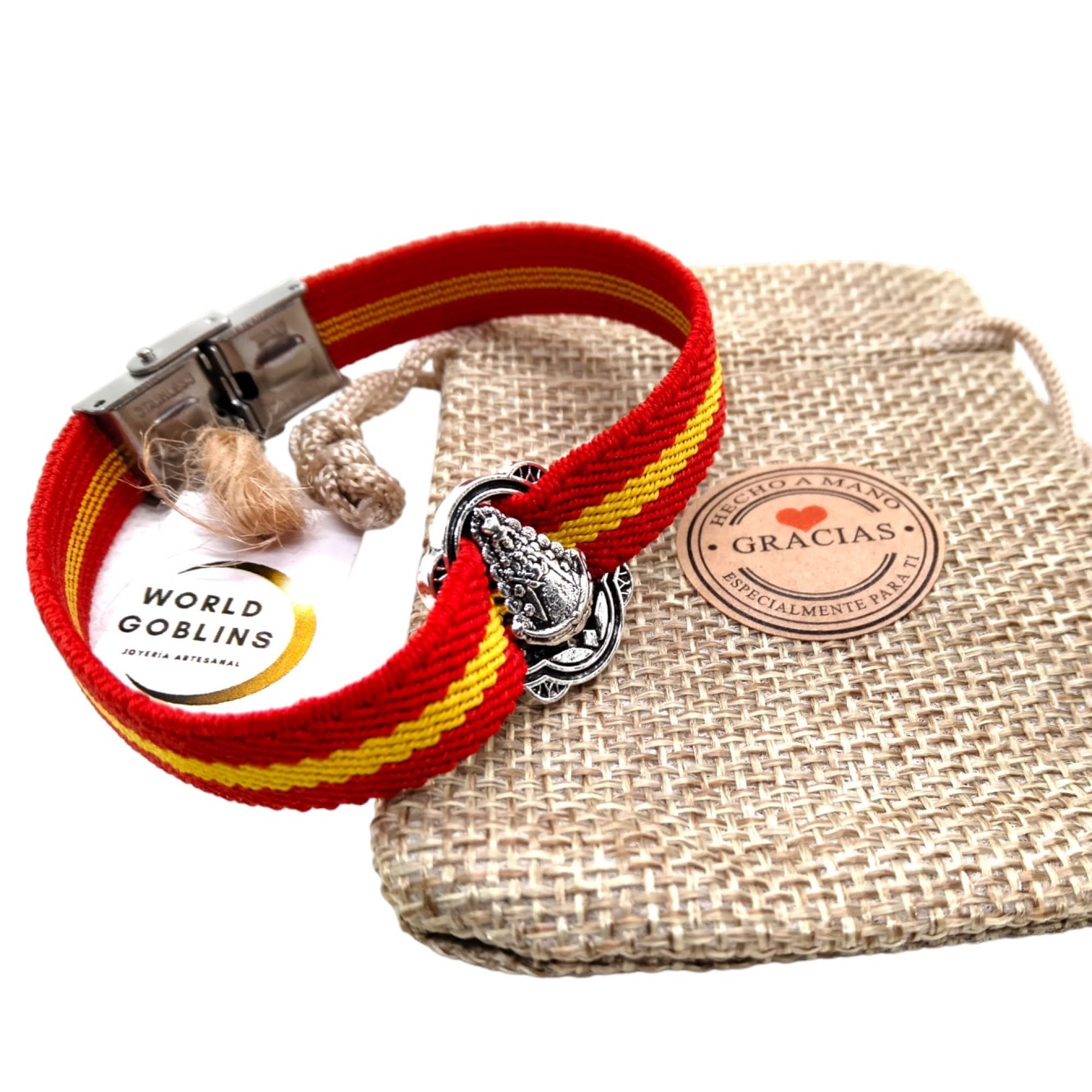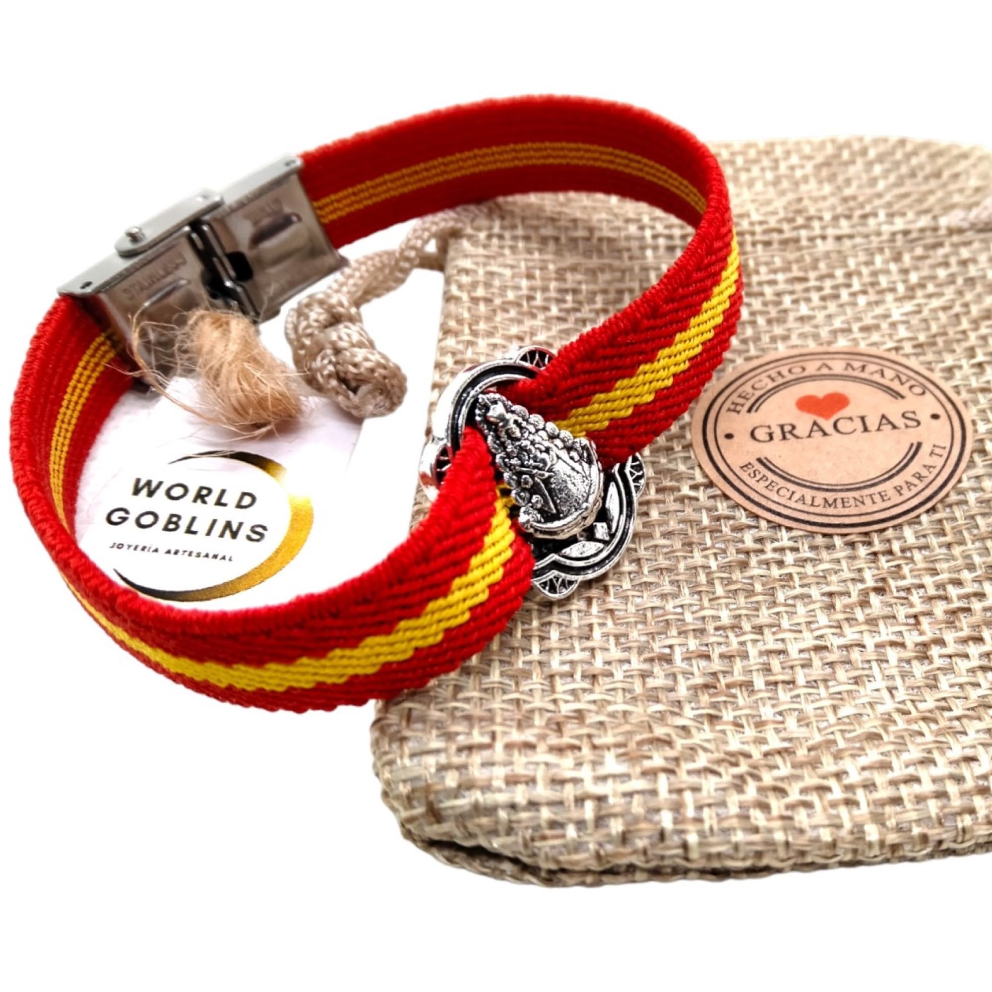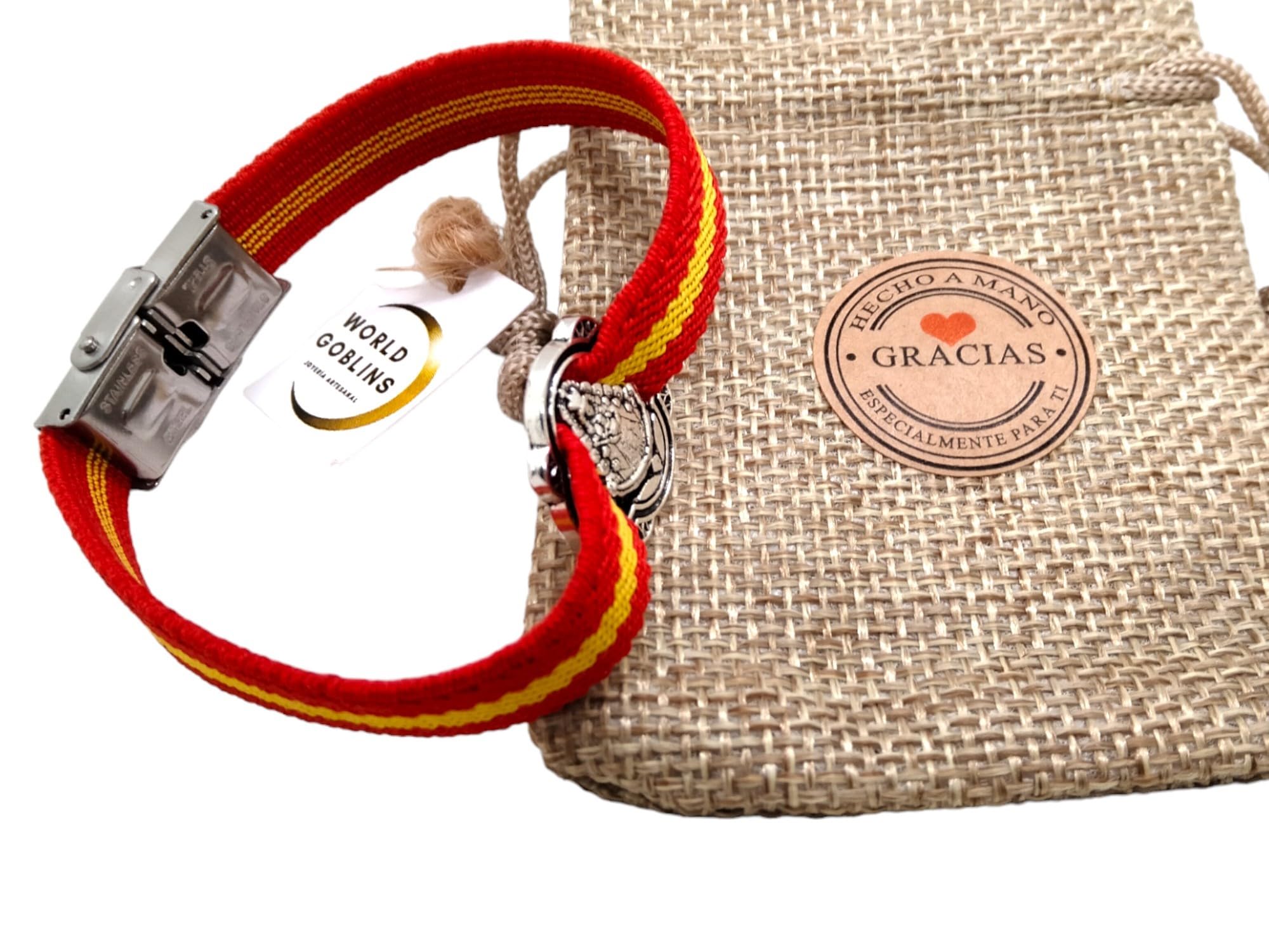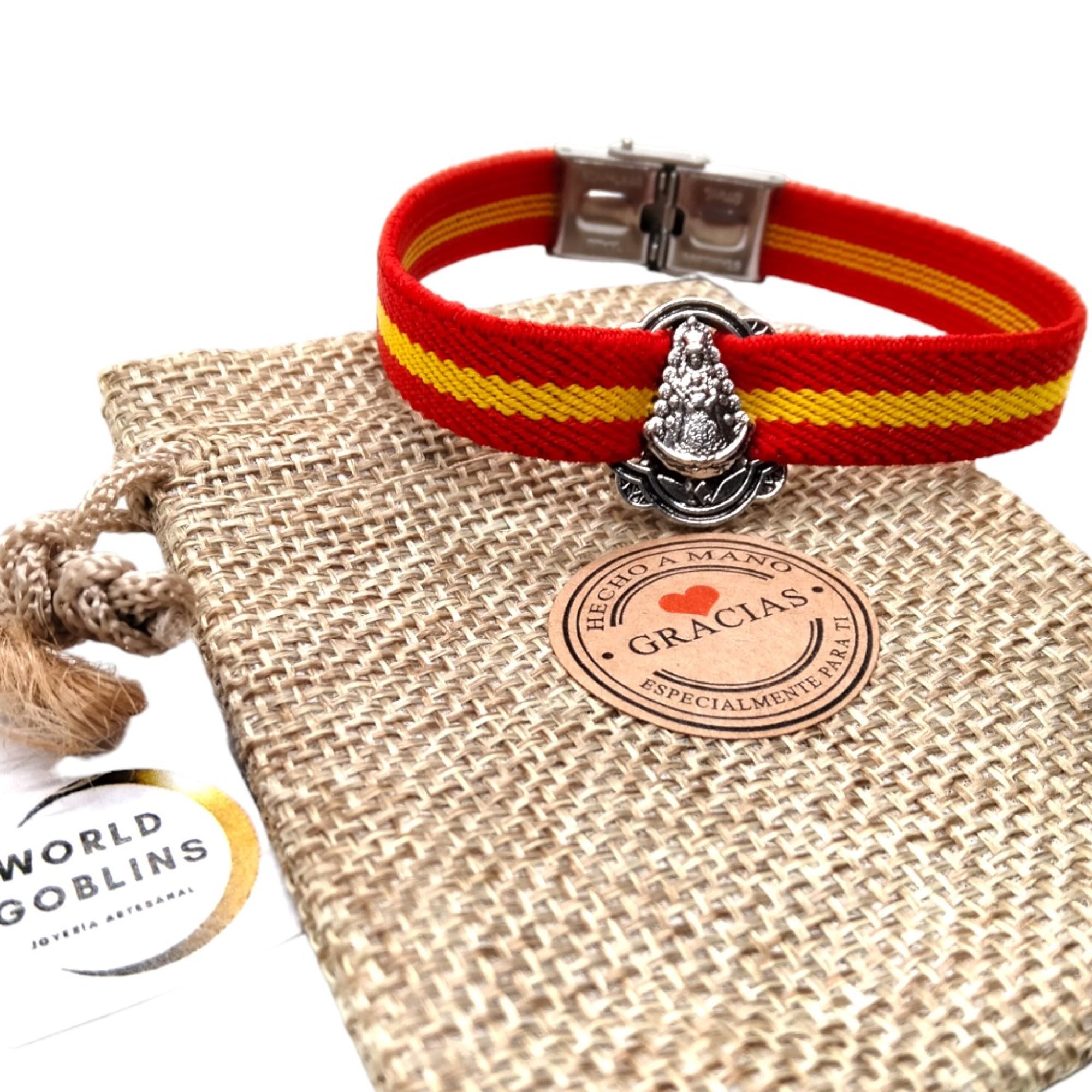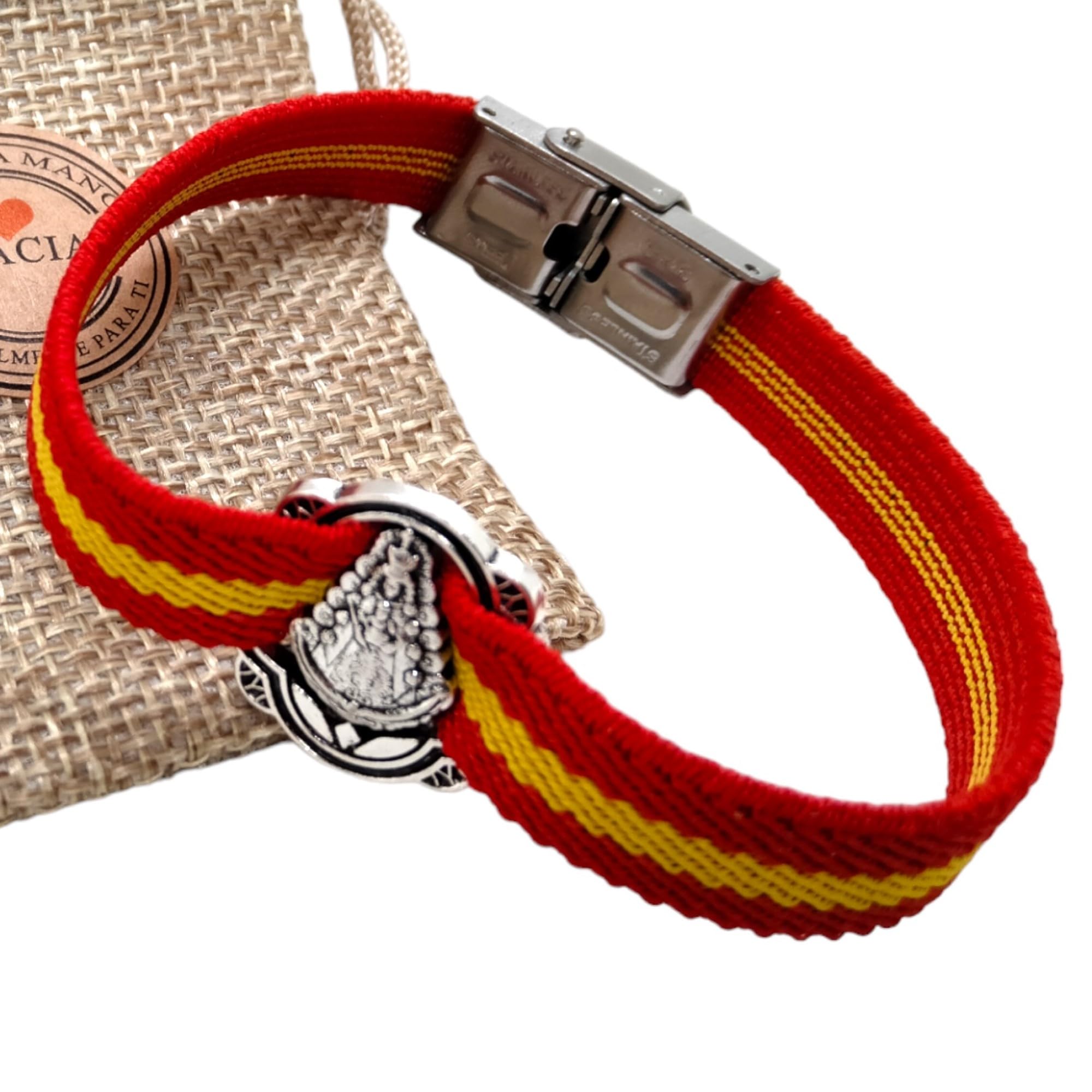 WORLD GOBLINS Pulsera de Tela Bandera España, Medalla Virgen del Rocío, Cierre Acero Inoxidable para Hombre y Mujer | Brazalete Elástico. Joyería Rociera Hecha en España. Regalos (España Guadiamar)